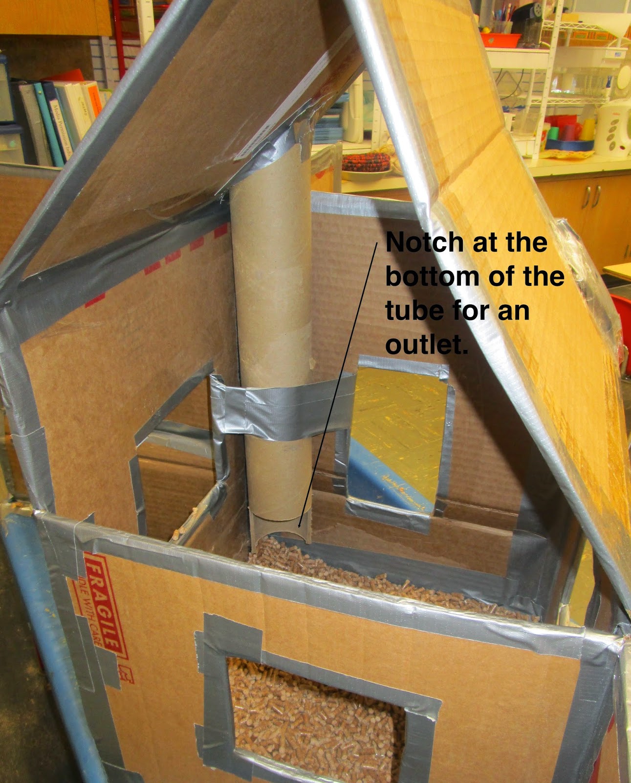 You can easily see the difference in in the children's operations with the false bottom in place. On the left, where there is no false bottom, the child has to stretch are far as she can to even get a cup. She gets the cup, but cannot reach the pellets. The child on the right, where there is a false bottom, stretches, but he is stretching to get the pellets.For the cardboard tube, I had to cut an oval in the roof so the tube would be straight up and down. If I just cut a circle the circumference of the tube, the tube would enter the roof with an incline perpendicular to the roof. If I tried to force the tube to be straight, I would rip the cardboard.