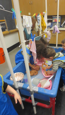 I decided to make one small change in the configuration of this apparatus. I strung the two clotheslines at two different levels. I was thinking of Axiom #3 on the right hand column of this blog: children welcome more levels of play and exploration in an apparatus. In addition, I added a table (my toddler sensory table with a cover) with towels so the children could bring the babies out of the water to dry them off and dress them as if on a changing table.