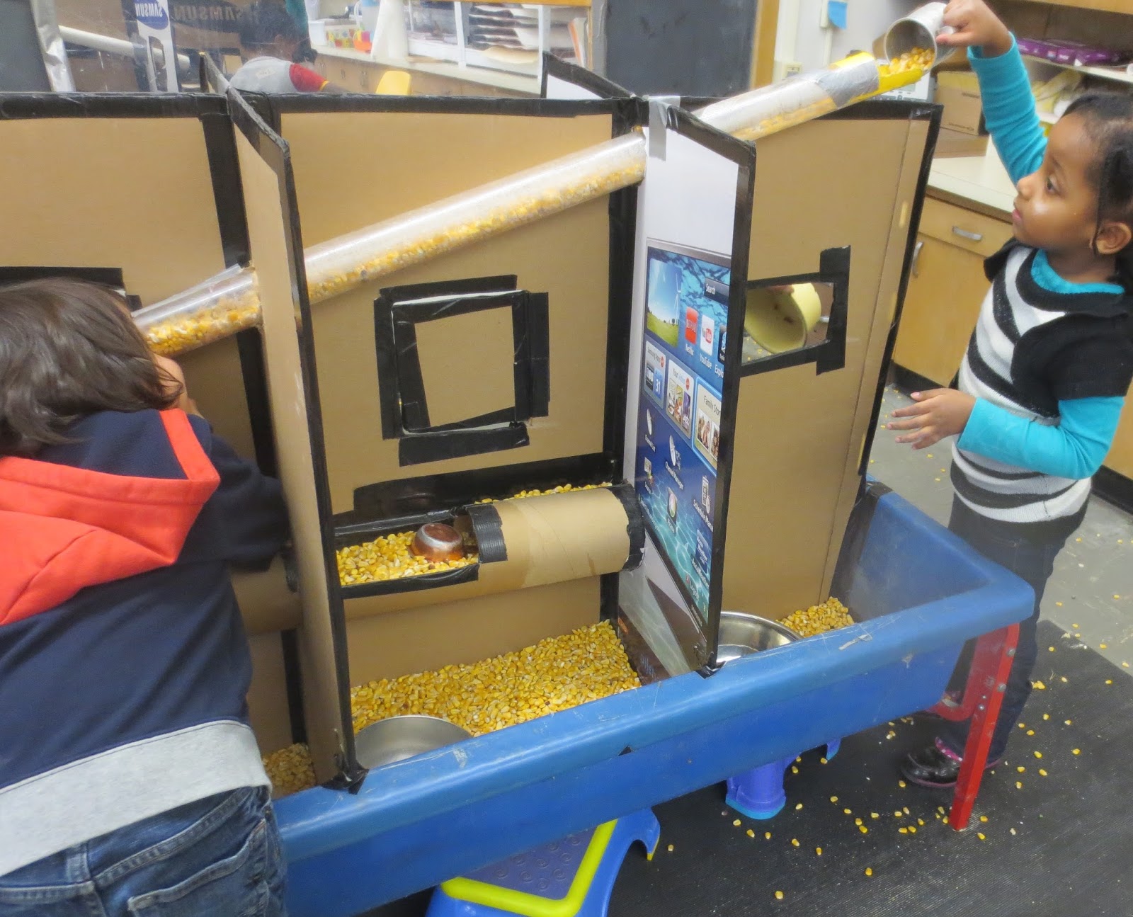 What happens to the catching experience when a child plugs and then unplugs the flow of corn coming out of the tube? Watch as this child removes the plug he has inserted into the tube.
