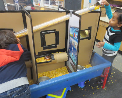 What does he discover with his actions that he did not know before? One thing for sure is how corn slides down the tube. Such an observant child will file this information away so when the medium changes or the incline changes, he will have prior knowledge with which to to compare his new experiences.