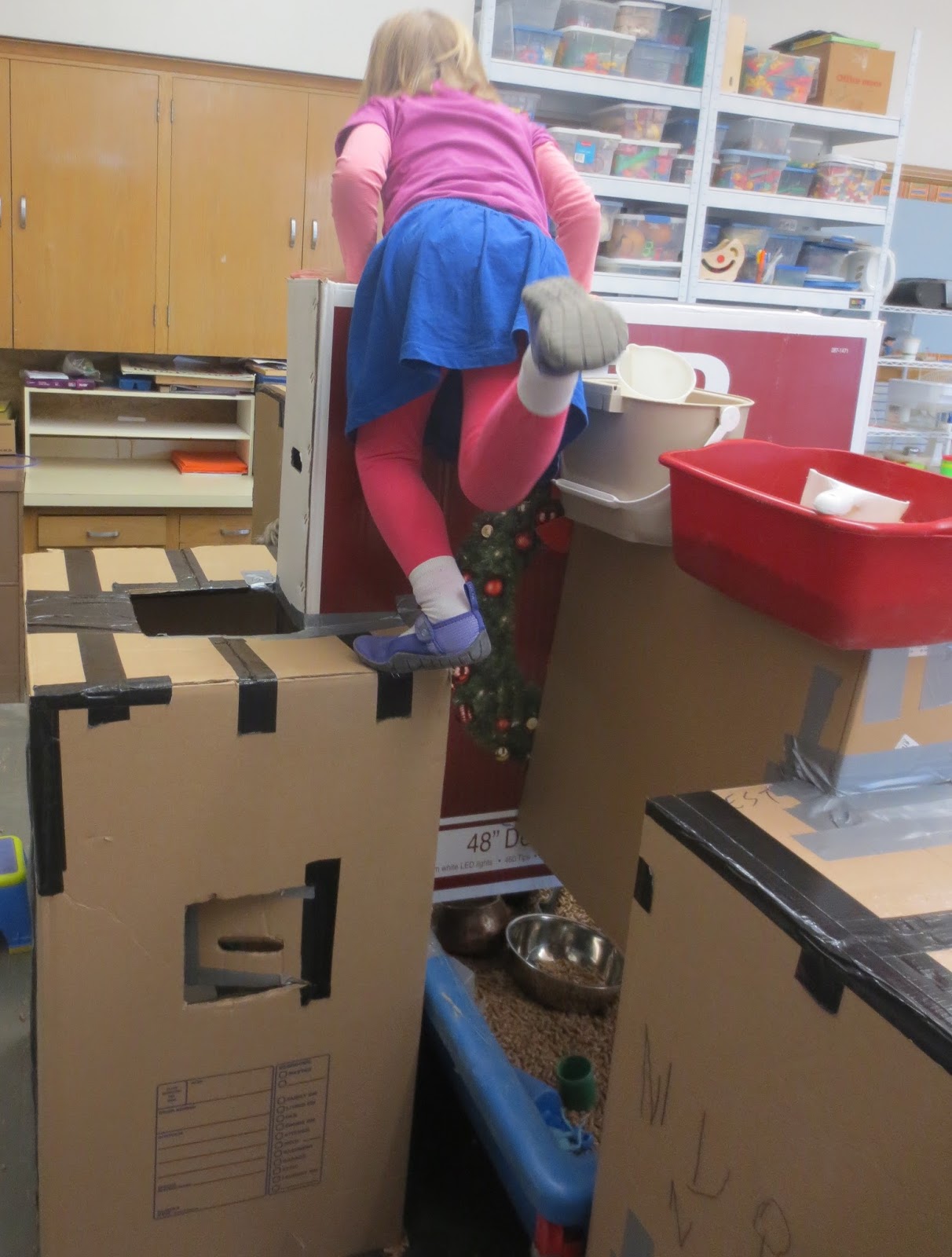 How exactly are they measuring those spaces? They did it with their bodies. The child in the box had to first figure out how to get in the box. Taking a measure of the opening, she figured out she had to crawl in. Once in, she could have stood up. Instead, she decided to kneel, probably because the parameters of the box she was sensing made it easier to work from that position. The child outside the box is also carrying out multiple measuring operations. She is giving pellets to the child in the box through the window in the connecting box (3). To do that, she measures the space between the two big boxes, the area under the connecting box, the height of hole in the connecting box, and the size of the hole. In doing all that, she has brought over a stool so she can reach as far into the connecting box as possible to give her friend pellets.