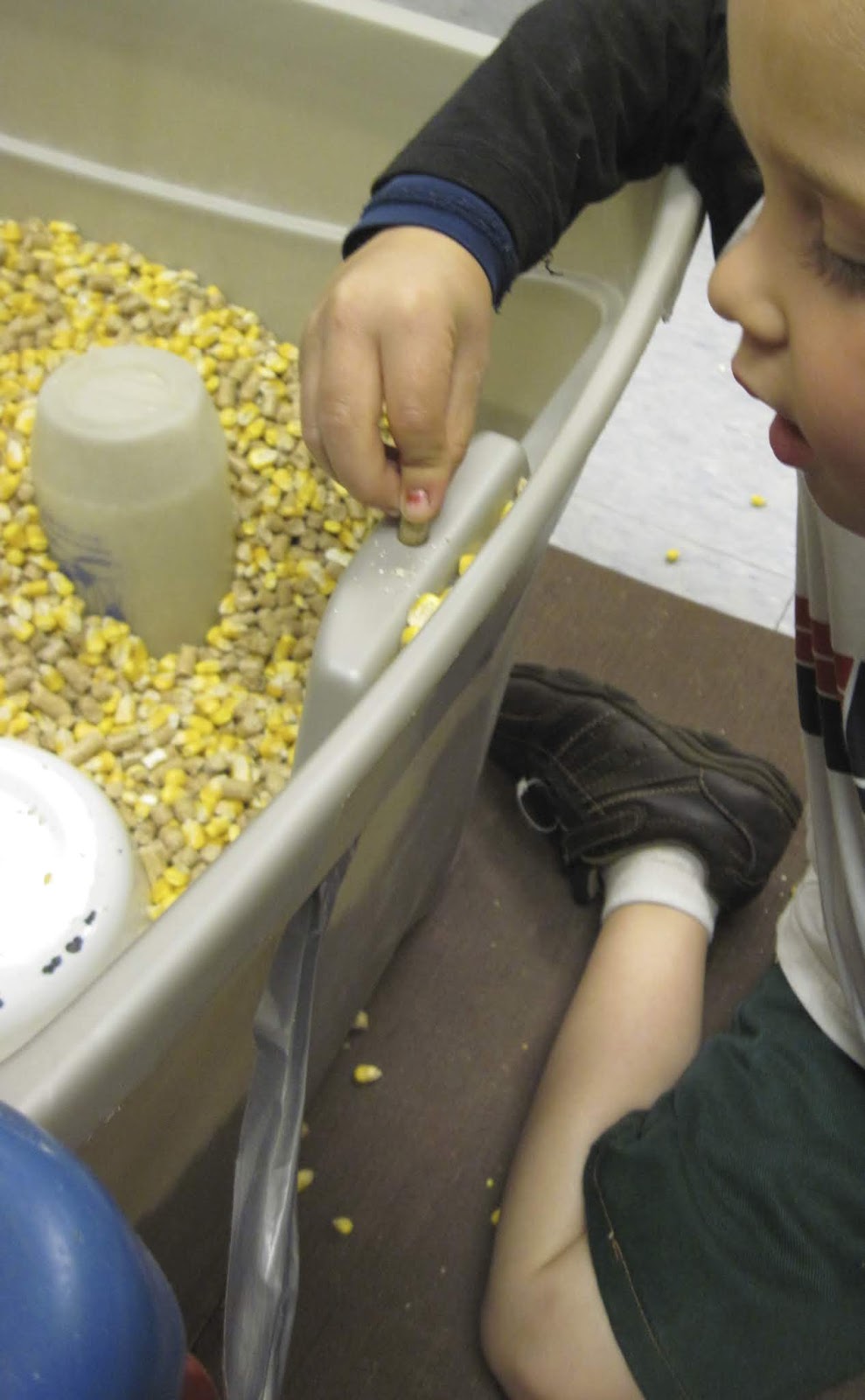 The children were certainly into filling their containers and pouring the corn down the box. Was it simply to fill the adult's container? Was it because of the sound the corn made traveling down through the box? Was it a combination of the two? Why did the steady flow of corn down the box capture the one child's attention essentially stopping him from pouring so he could observe the flow of corn?