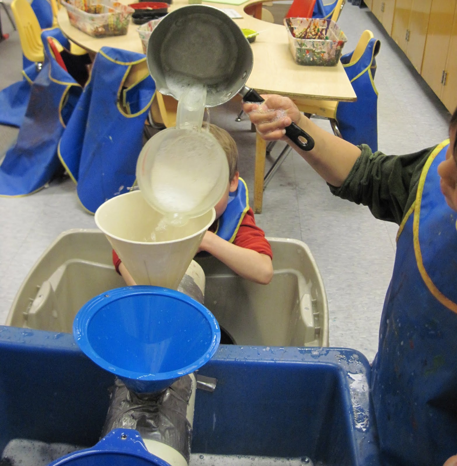 The child pictured below used a funnel to create a tool to insure that all the sand he poured into the top funnel went into the plastic bottle on the bottom of the tub.