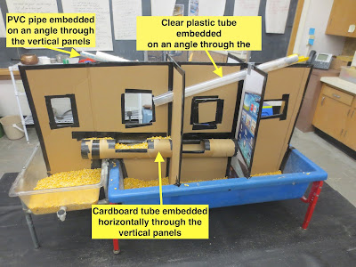 The cardboard walls of those cubicle-like spaces actually allowed the children to reach a higher degree of focus to better know the properties of corn. I kept the divider apparatus up for a second week, but I added some new features. I added a PVC pipe and a clear plastic tube both on angles through the cross vertical panels on either side of the apparatus. I also added a cardboard tube embedded horizontally through the cross vertical panels.
