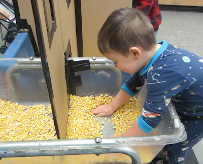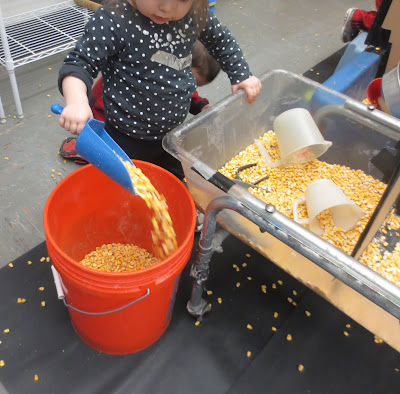 The child below also gets up close and personal with the corn---with her feet! Not only does she step into the bucket, but she maneuvers her feet so her boots begin to sink further into the bucket of corn. There is certainly a different feel to the corn when a child uses her feet. For instance, individual kernels drop down into her boot. When she comes out, she feels those individual kernels pressing against the soles of her feet. And what is her visual interpretation of seeing her boots/feet disappear down into the corn?