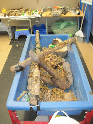 About the same time I set up the log in the sensory table, I was walking down by the river and found some long narrow sticks. What caught my eye was that some animal---a muskrat?---had chewed them down and ate much of the bark. I gathered a bunch of the sticks and set them in a bin next to the sensory table.
