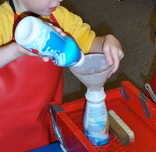 Two quick notes about this apparatus. If you are using it for water, caulk the seams with a bathroom caulk otherwise it will leak at the joints. Also, if you are using it with water, drill holes in the side so water will leak out into the table otherwise the children will fill it to overflowing. That is bad if your tray hangs over the side like the one pictured. I have had to adjust the size and number of holes depending on the creativity and enthusiasm of the group. If there are too many holes, I easily correct it with duct tape.