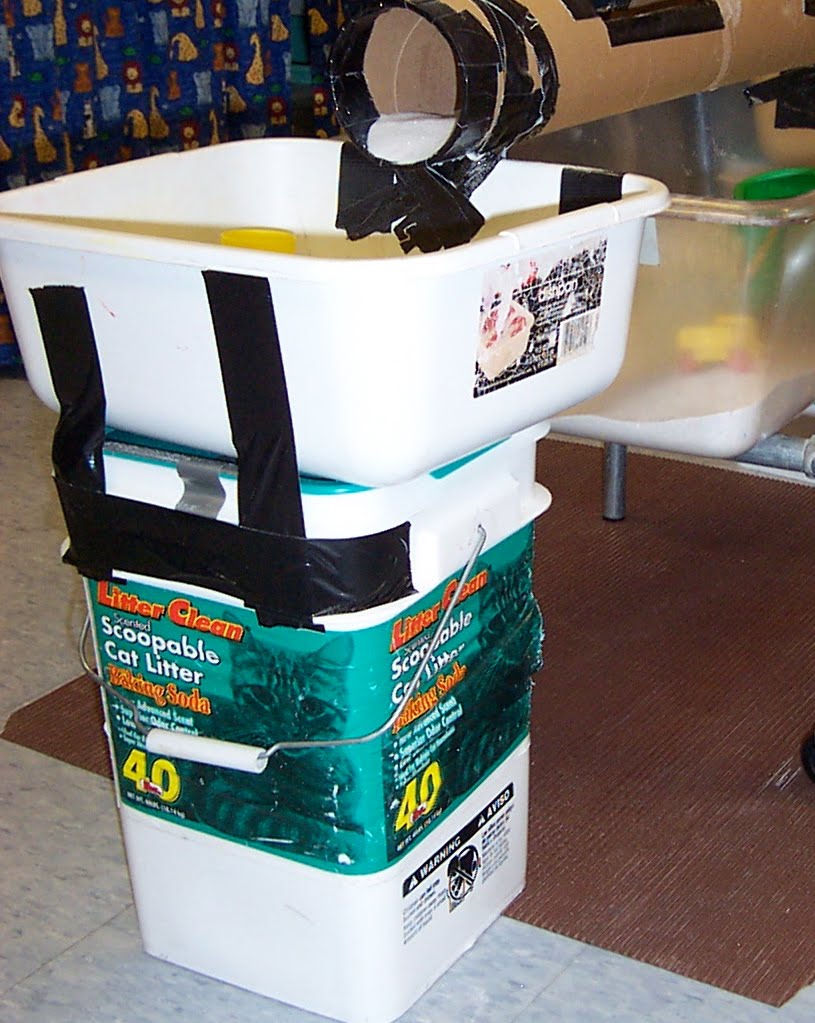 Two quick notes about this apparatus.  If you are using it for water, caulk the seams with a bathroom caulk otherwise it will leak at the joints.  Also, if you are using it with water, drill holes in the side so water will leak out into the table otherwise the children will fill it to overflowing.  That is bad if your tray hangs over the side like the one pictured.  I have had to adjust the size and number of holes depending on the creativity and enthusiasm of the group.  If there are too many holes, I easily correct it with duct tape.