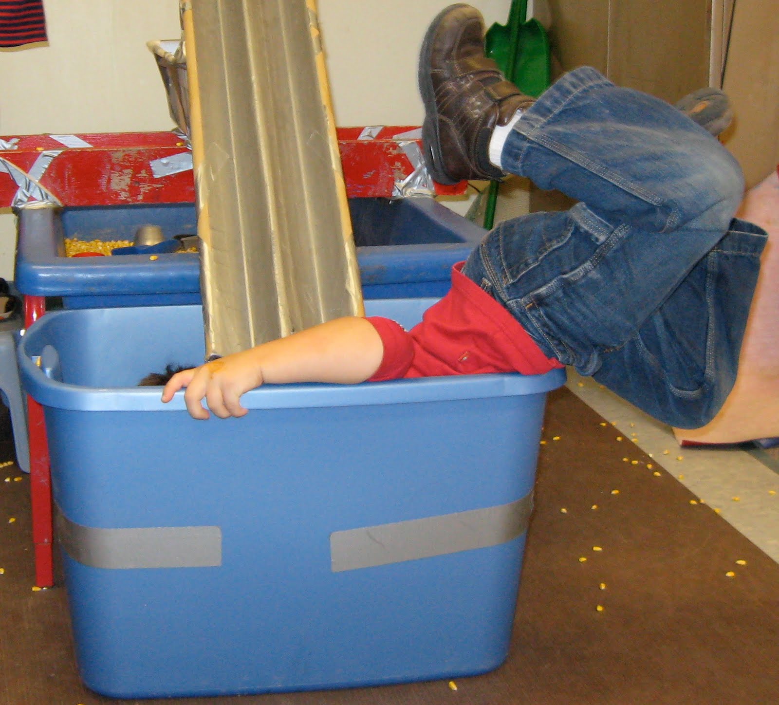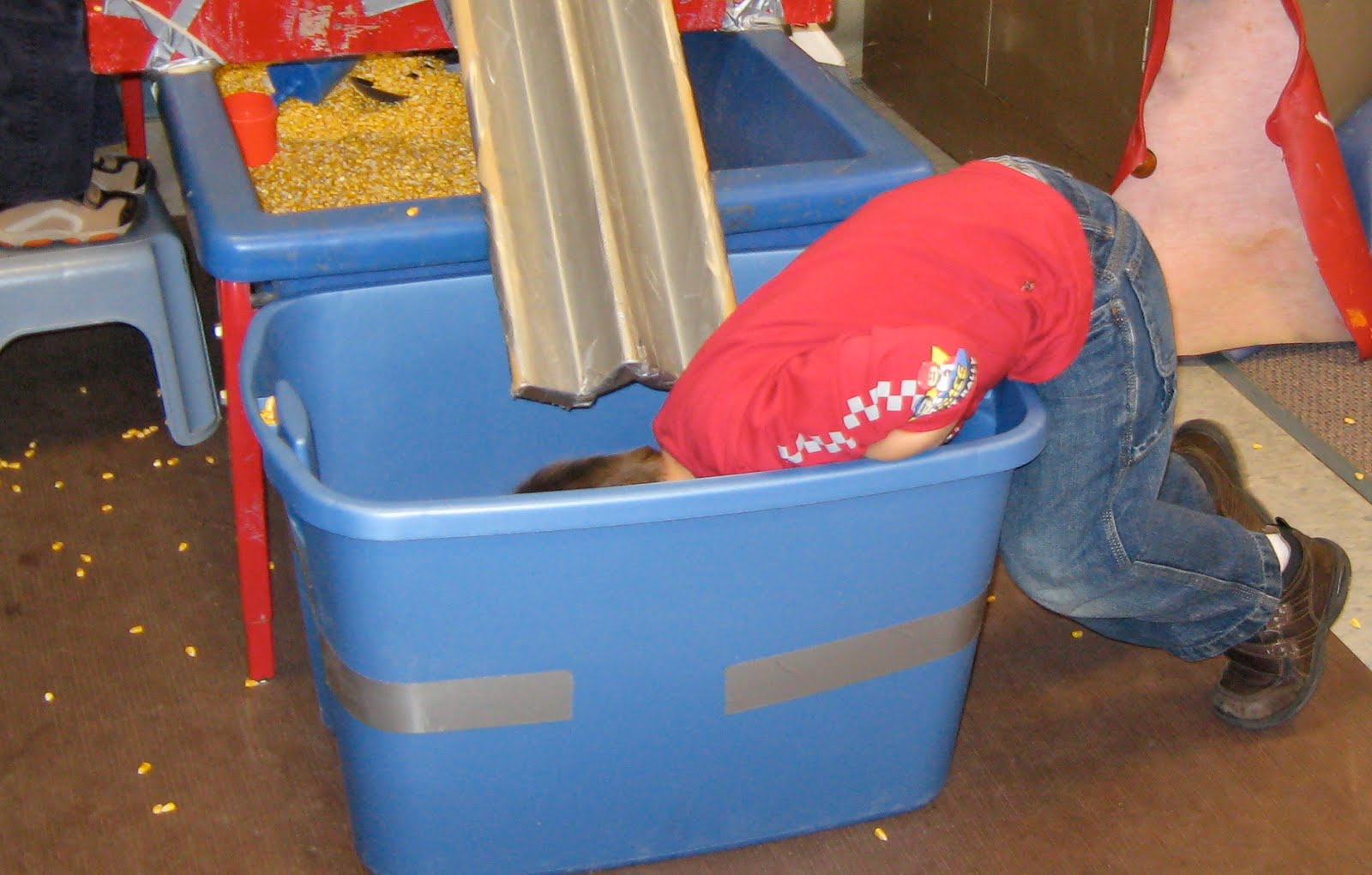 In terms of exploration and learning, the tray provides another level on which to work.  If you are keeping count, there are now three levels at the table.  1) There is the bottom of the table itself.  2) The pail (see previous posts) which is on the floor.   3) The tray which is above the table.  The three levels have increased the spaces to explore because now there is an over, under and around.  When the child moves or is transporting over, under and around the tray, a different set of large and small muscle motor operations are required.  For example, you cannot just scoop something up from under the tray and lift it straight up.  The child has to scoop and then lift slightly and reverse the original scooping motion.  All this lays the ground work for cognitive mapping of spaces and how to operate in and around them.