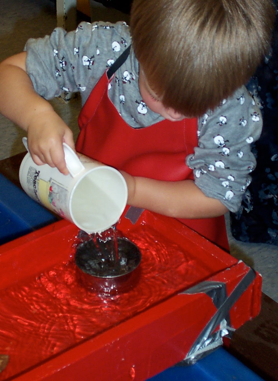 I wanted to provide a space on which to put things that were in the table.  I have seen so many children hold a container against their body when they try to fill the container.  What happens?  It spills and they get wet.  With a tray, a space is provided on which to place things. That way they do not have to hold the container against their body to fill it.