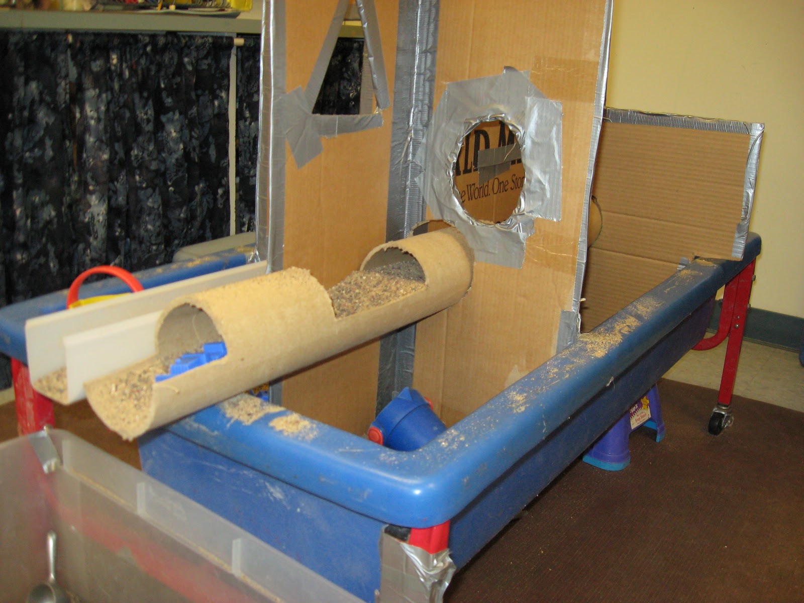 In another version of this combined apparatus, an additional plastic florescent light cover is embedded in the divider. This configuration is a little different because the table is used to support one end of the tube and channel and both the tube and channel extend over the end of the table so children can push the sand out of the tube and channel into the tub below.