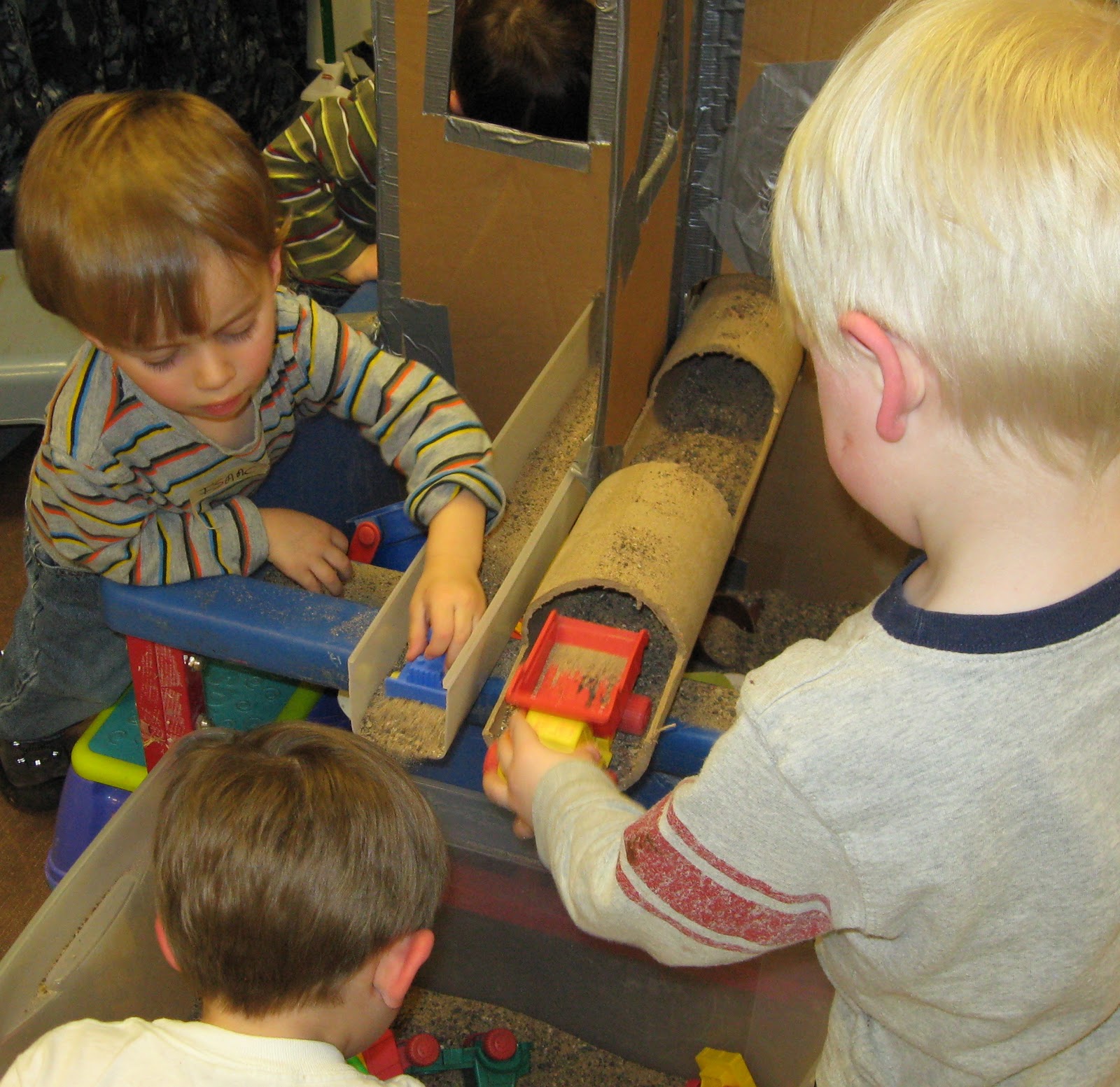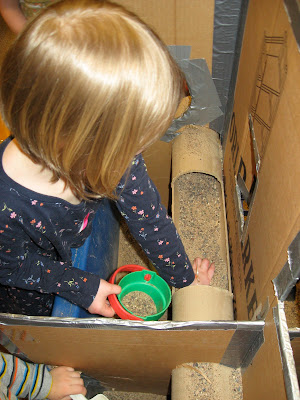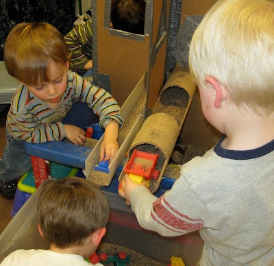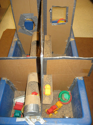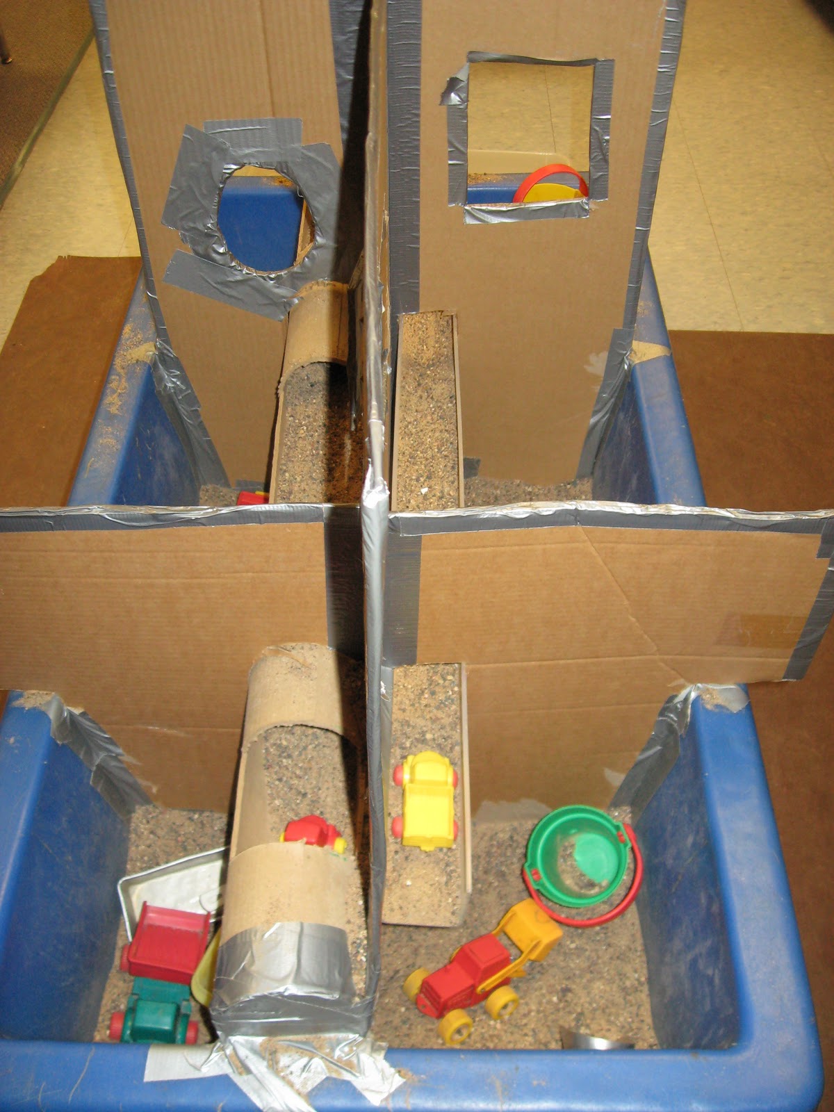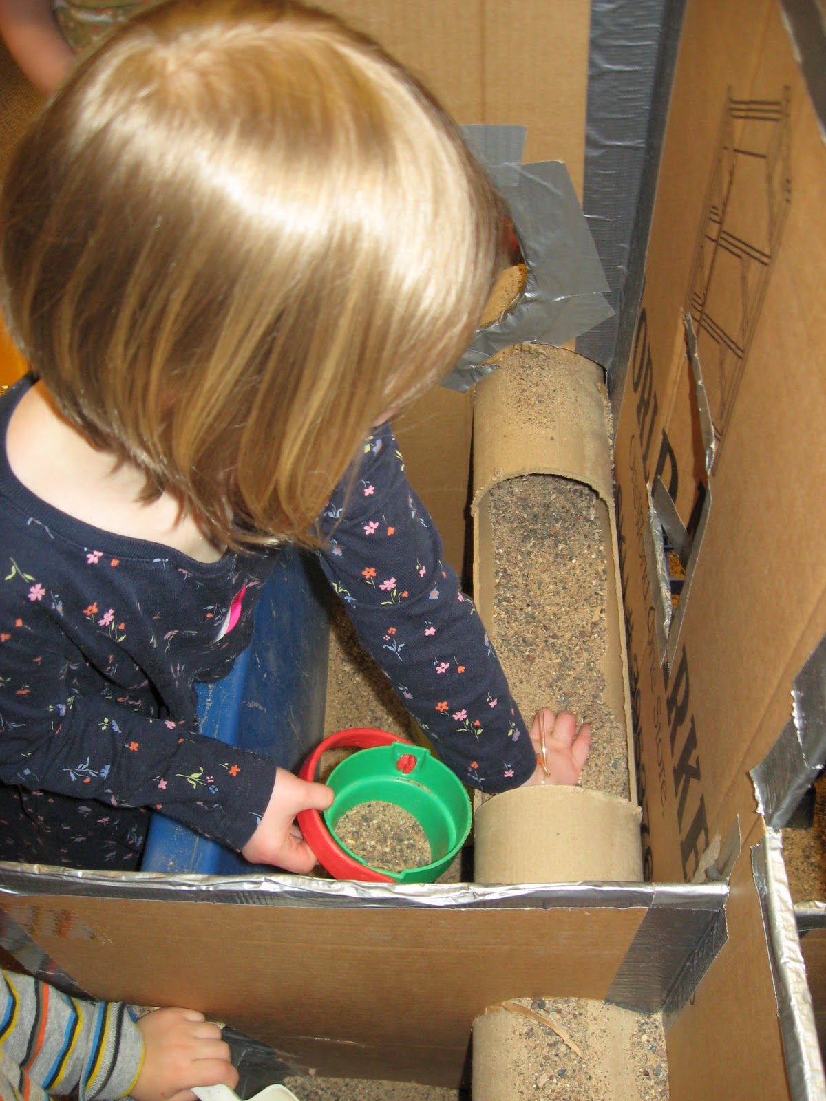 Little construction vehicles are added because they fit nicely into the tube and channel and create a different type of play with moving the sand with front loaders and bulldozers.
