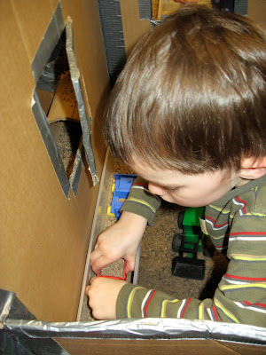 A hole is cut in two of the panels on one side. The cardboard tube is threaded through the holes and taped. A section of the tube in the middle has been cut away. Now besides the open spaces created by the vertical walls of the divider, the tube creates both horizontal and closed dimensions to the apparatus.