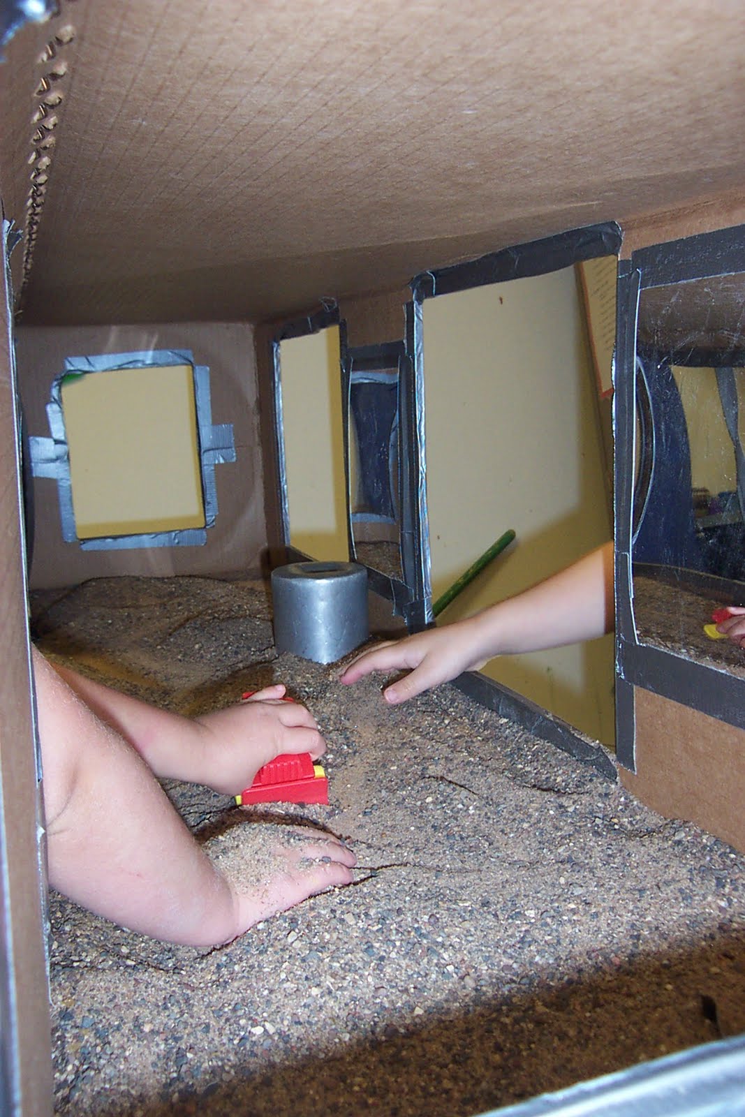 One of the things I like to do with this apparatus is add mirrors inside across the openings cut on the side of the box. Even if a child doesn't see himself, others get an interesting perspective.