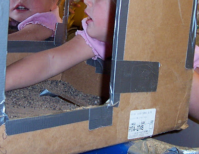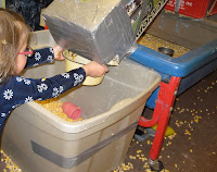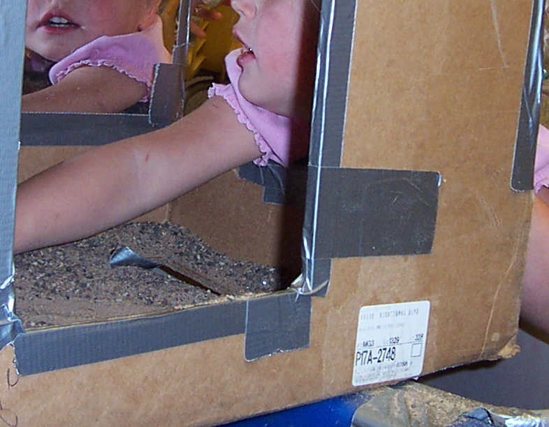 If you look at the above picture, you might think that the corn or sand is blocked at the bottom of the chute by a cardboard piece. There is actually a slit cut in the bottom of the box before the cardboard piece that allows the sand or corn to drop into the tub next to the table. If you look at the picture below, you can see the slit just below the girl's arm.