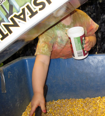 or whether you want to climb right into the bottom of the box to push the corn up with your bulldozer. By the way, do you see that the boy has also climbed into the tub---his leg is visible in the tub---to be able to reach into the box. Hey, it sounds like more stretching and balancing work with this apparatus.