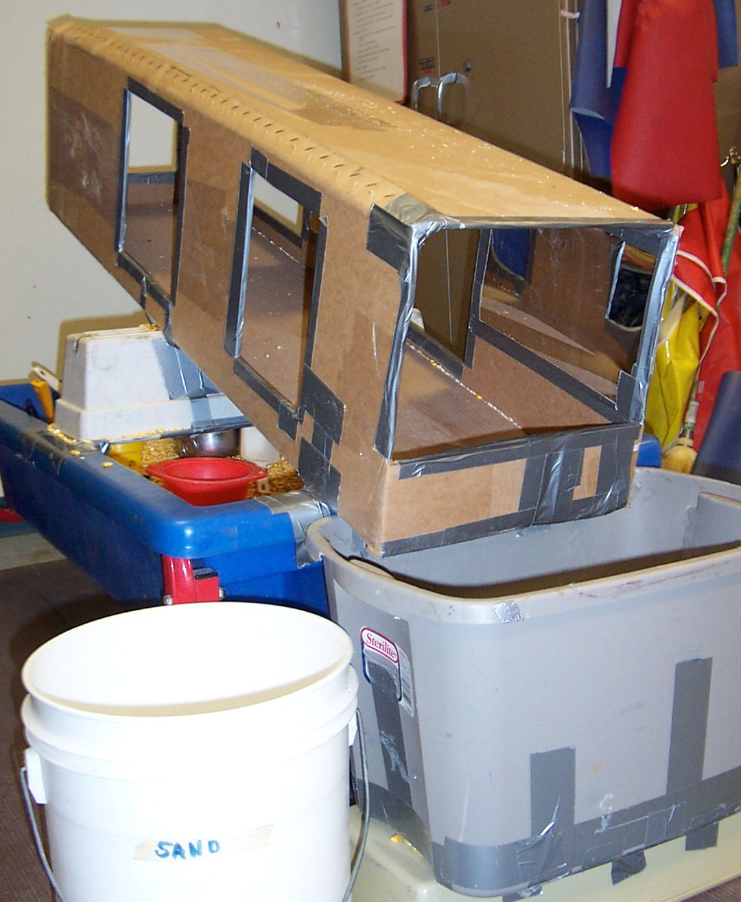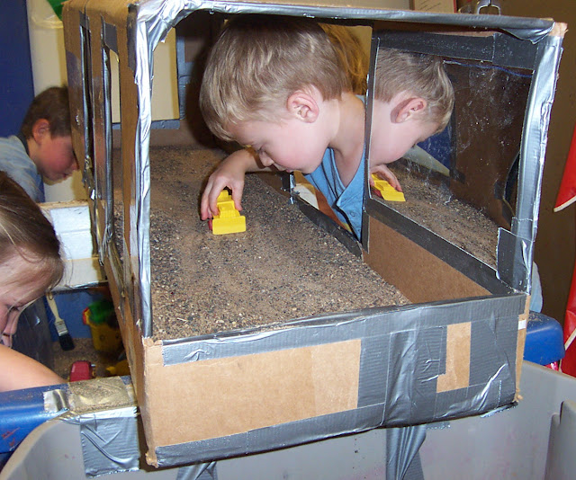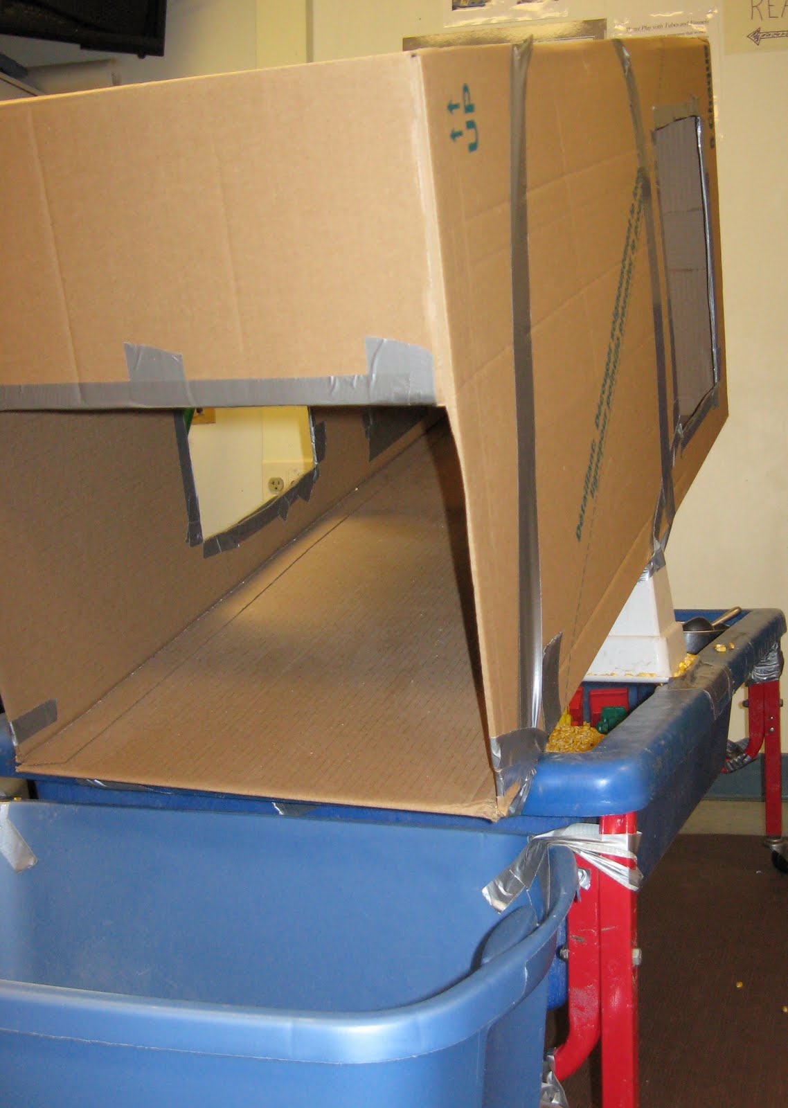 I used a planter tray turned upside down to support the box and give it its incline. The end of the box was set over the lip of the table so when the children poured the sand or corn into the inclined box, it would drop into a tub next to the table. The box was very sturdy, so there was no need to reinforce the structure. This is essentially a large, enclosed chute.