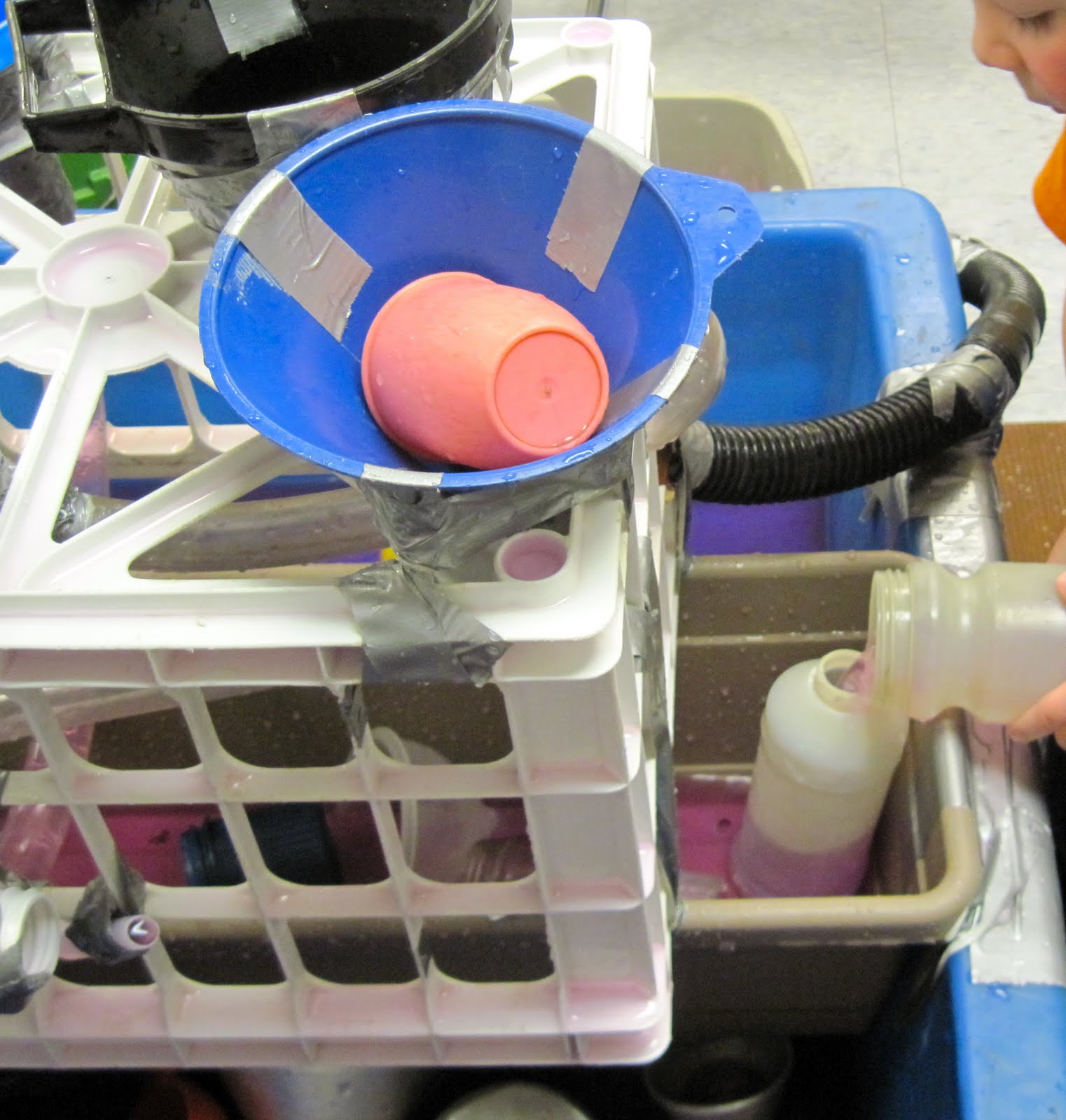 The week I had this up, some school age children visited my room. After the session, one of them said: "I got all wet, but it was totally worth it." What I found is that provisions and loose parts like loose funnels and tubing really encourages a lot of play for the older children. I get the tubes at a hardware store in the plumbing section.