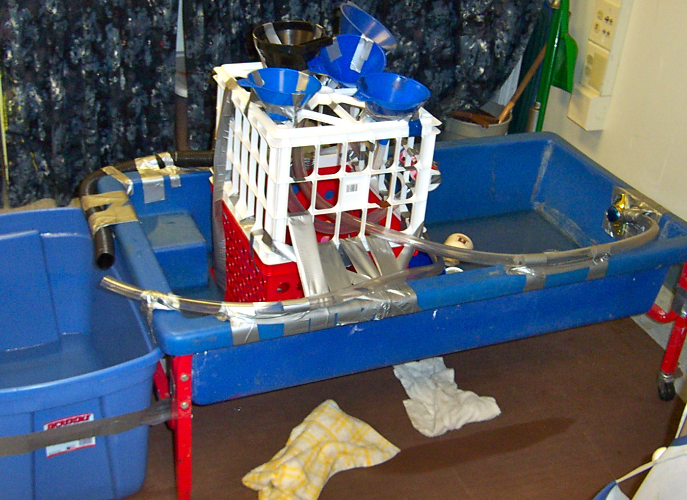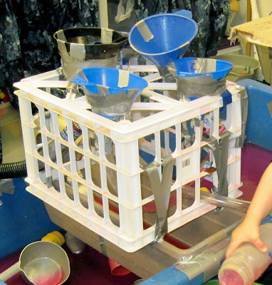 I purposely thread the tubes in such a way that it is not obvious where the water comes out. For instance, a funnel on one corner of the apparatus can empty on the exact opposite side of the crate. That way, the children have to figure out where the water comes out when they pour water into one of the funnels. There are a couple ways of doing that. One, you can pour the water into a funnel and listen to where the water comes out. It can get a little tricky, though, because there is always a delay from pouring water into the funnel and water coming out, especially if the tube is one of the long ones. And besides, if more than one child is pouring into the funnels, the water is coming out in more than one place at the same time. A second way to figure the path of the water is to track it through the clear tubes. The children see the water better if it is colored. Either way, you can literally see the children working out which funnel empties where. When they do, it is a wonderful discovery.