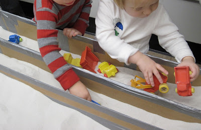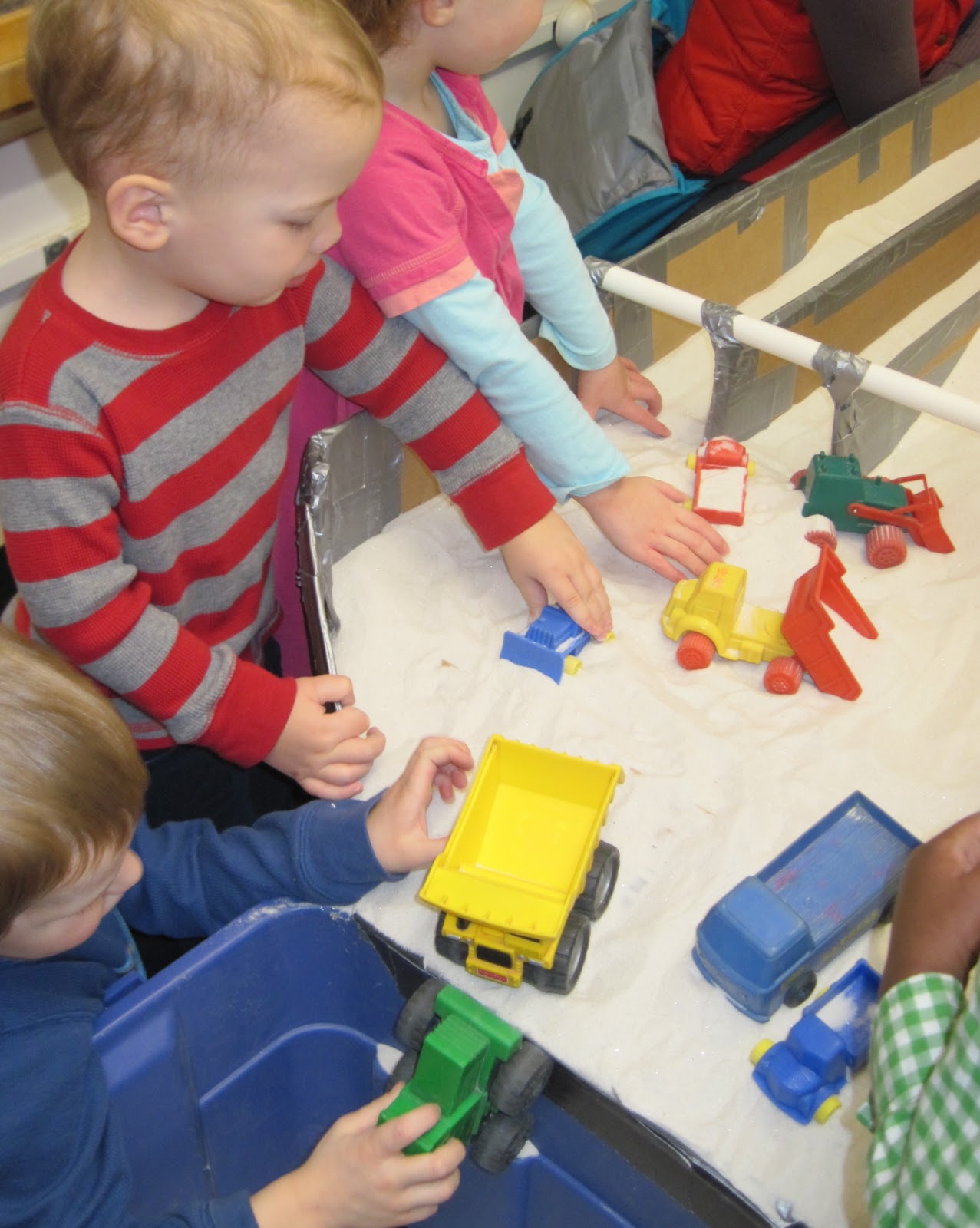 That is a nice lead-in to another reason I like this apparatus: when you have many children around the table at the same time, you are creating lots of opportunity for the children to negotiate space. Look at the picture below. The two children are almost in the same space. The boy is actually reaching across the girl's body to move his truck.
