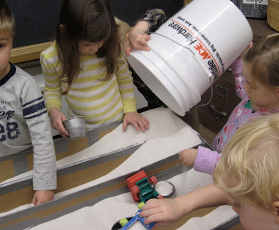 This apparatus is a large box that is long, flat, and narrow and has one of its large sides cut away. Cardboard dividers are inserted to make channels. The whole apparatus rests on top of the lid of the sensory table. This post tells you how it is made. This post illustrates types of play that occur around this apparatus. And this post highlights some infectious play that emerged at this particular apparatus over the past couple of years.