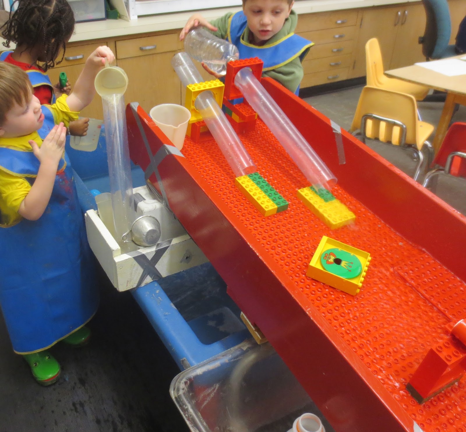 1. Yes. I had the Duplo Wall Boards on the wall in my room with letter tiles and shape tiles. A colleague showed me something her son had built for the water table out of legos and I knew I had to find a way to incorporate them at the water table. I like the incline because those little nubs that stick out of the Duplo Board slow down and disburse the water.