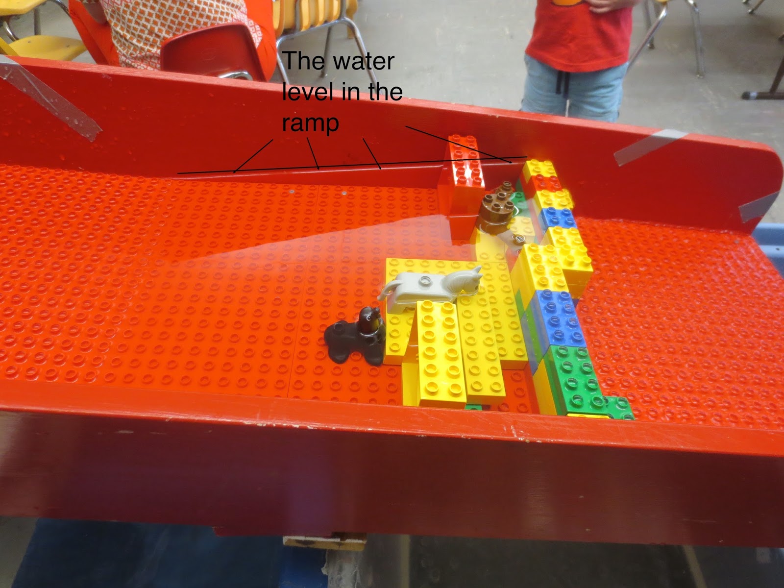 One of the decisions with the first design was: What should be its incline?  If the ramp is too steep, the water rushes down the ramp too quickly for the children to notice how the water is disbursed by the Duplo nubs.  With less of an incline, it is harder for the children to scoop the water from the table because they have to reach under the overhanging ramp.