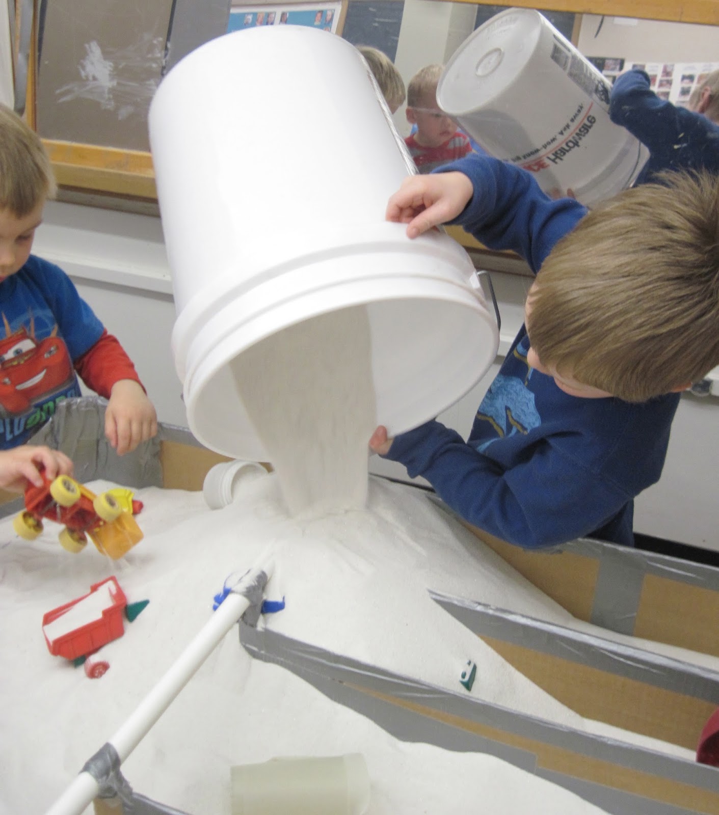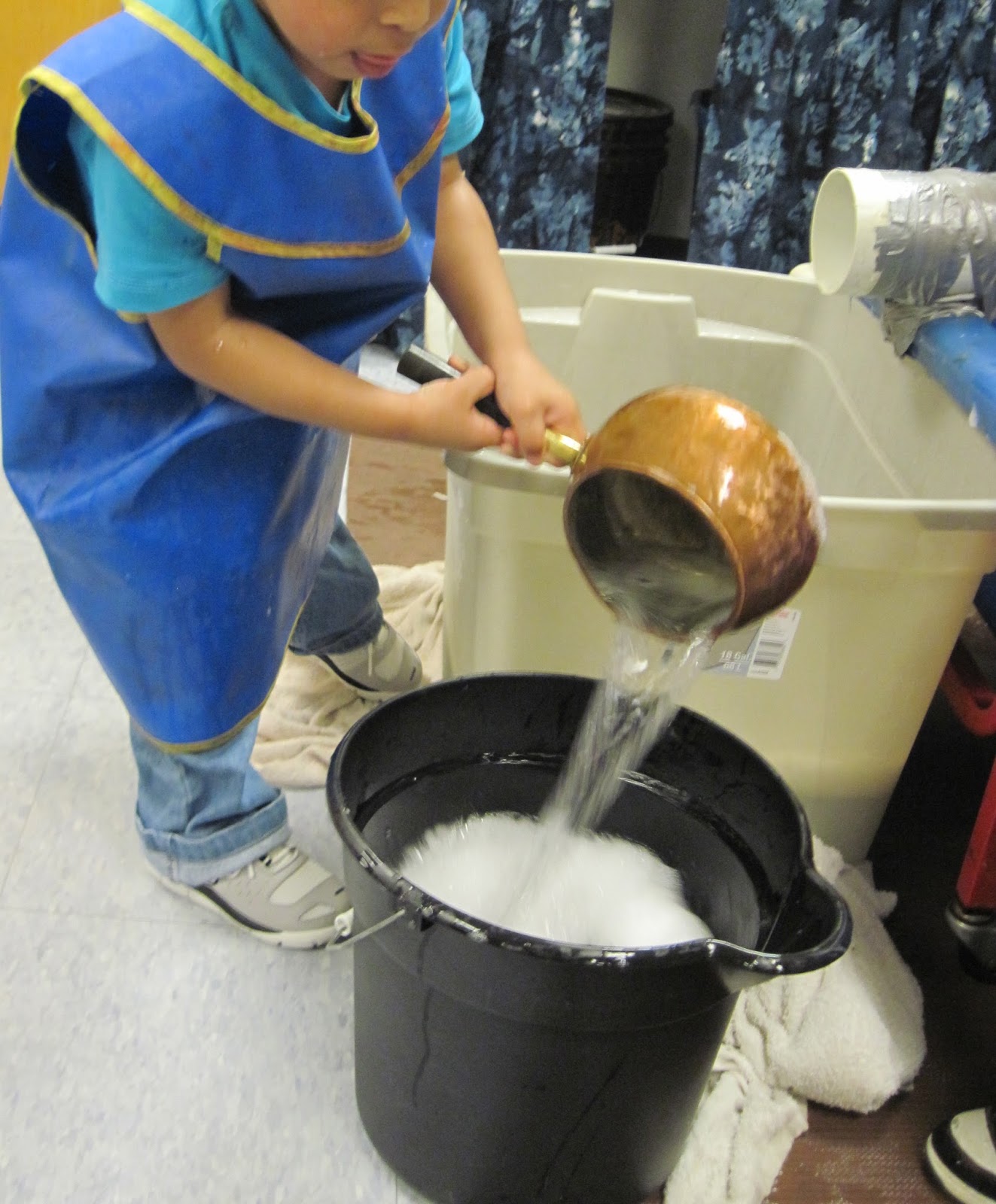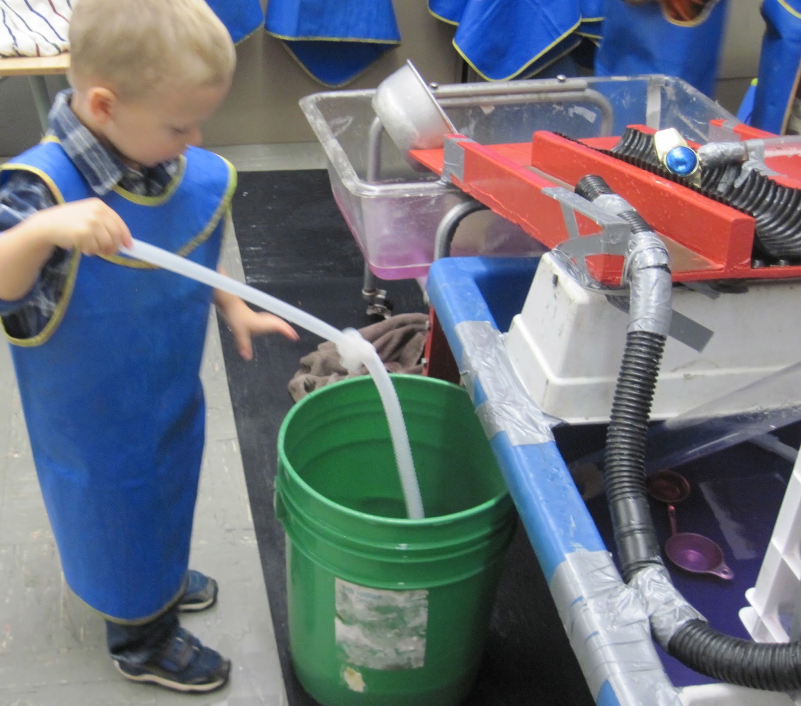 Last week's post was called Ruminations on a Bucket.   Twenty-five years ago I realized that by placing a bucket next to the sand table, children demonstrated an overarching need to transport the sand from the table into the bucket.  (They had been telling me all along, but without the constructive outlet---the bucket---to fulfill their need, I only saw children dumping the sand on the floor.)  From watching the children move the sand from the table to the bucket, I formulated axiom #1: Children need to transport whatever is in the table out of the table.  (You can see the axioms in the right-hand column of this blog.)