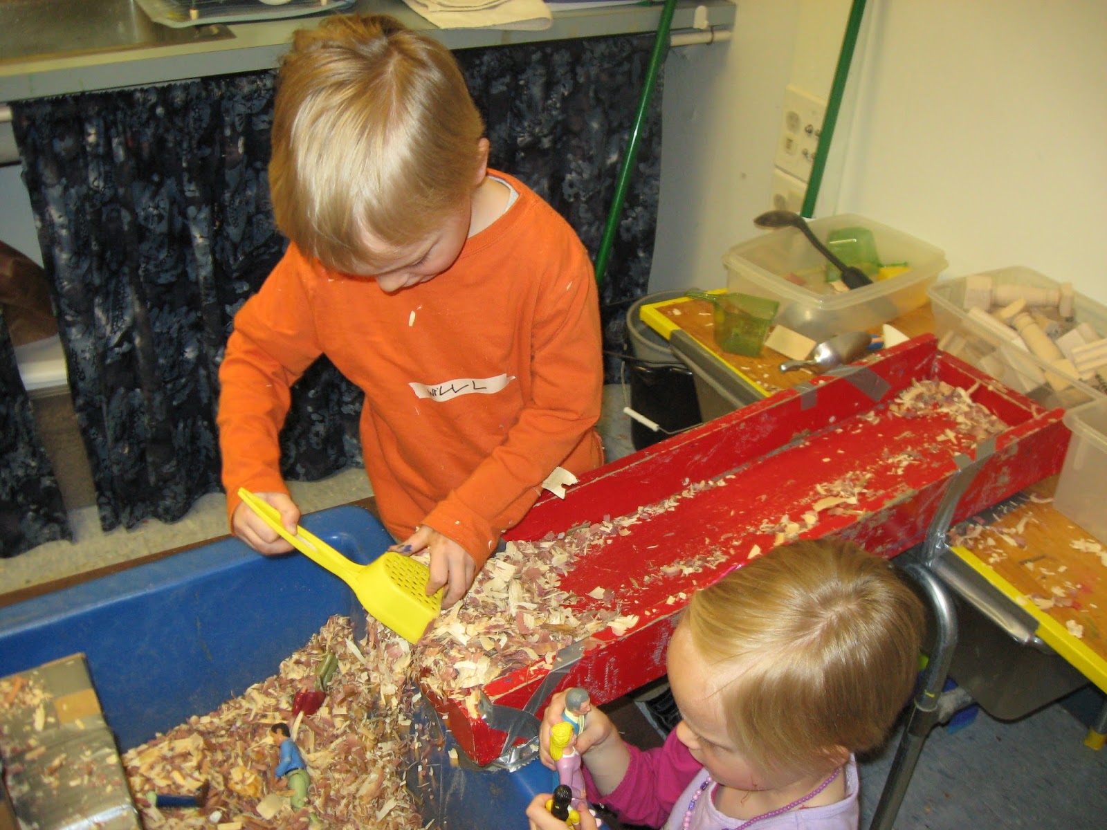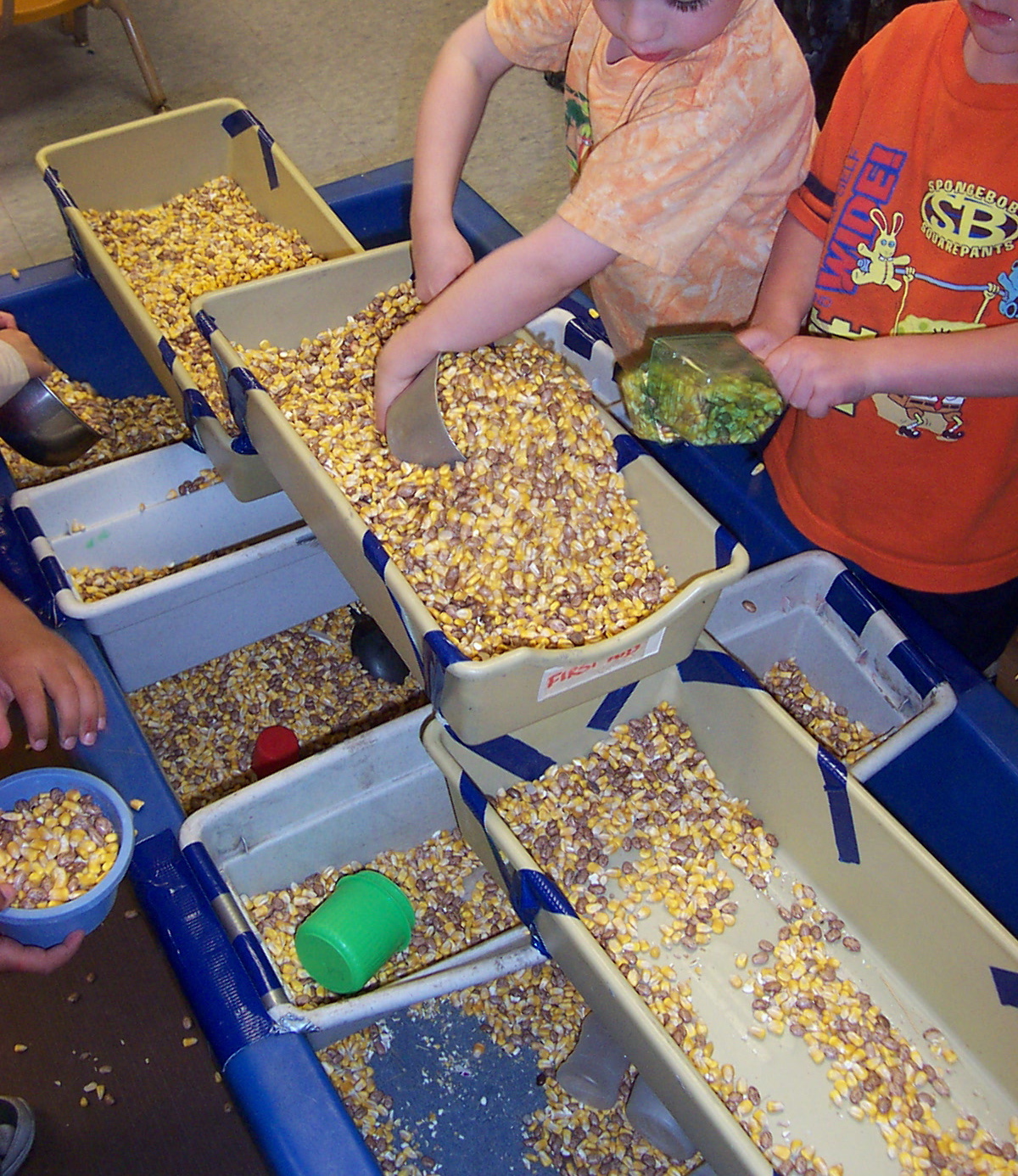 Did it work? Yes, sometimes, like in these two pictures. Instead of holding the container against their chest, these two children chose to place the container in the tray and to pour hands-free. Notice the child on the left is overfilling his container---but none is going in his shoes.