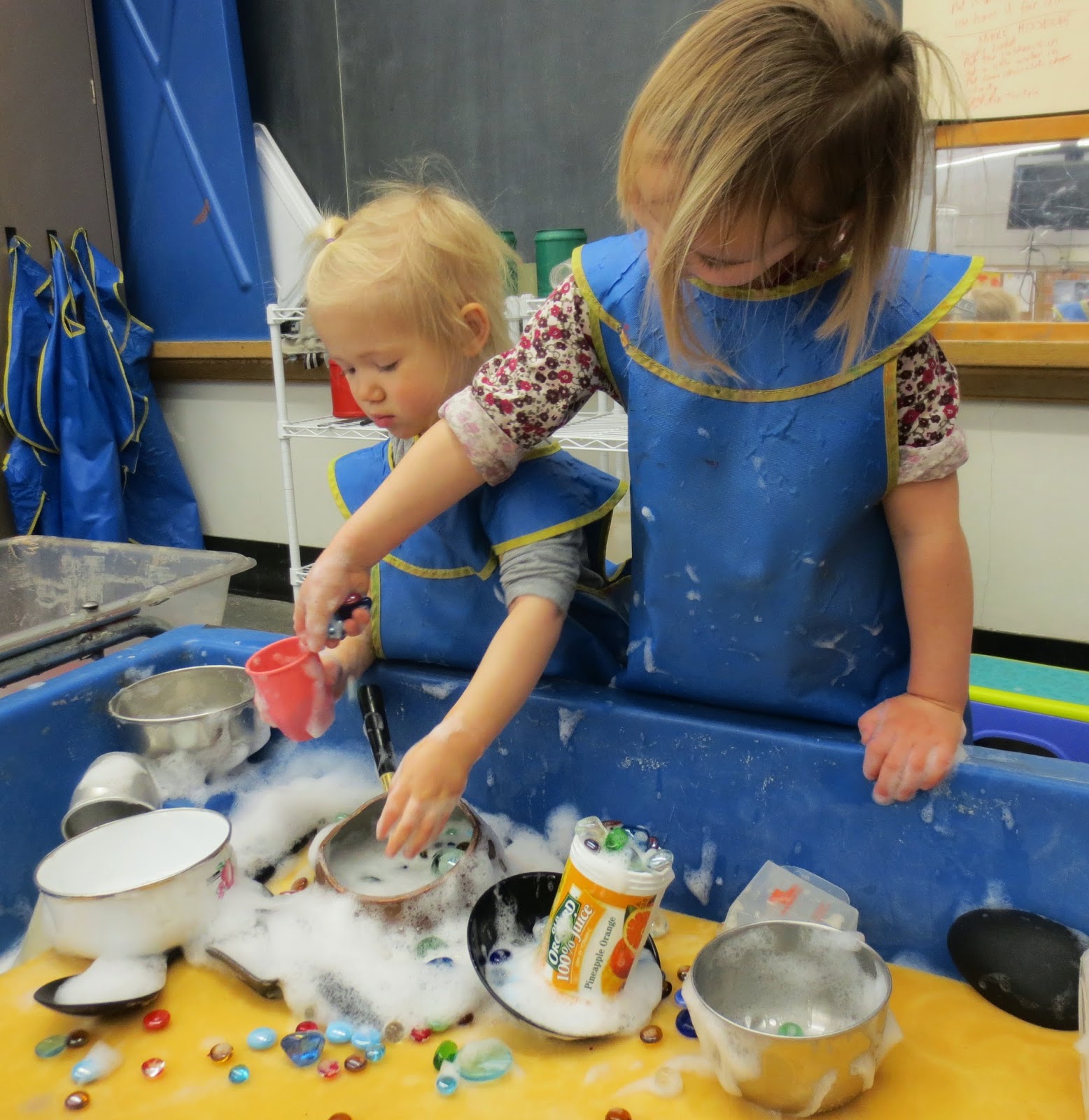 The first child is collecting the jewels she retrieved from under the sponge in a plastic juice can. The other girl is collecting suds in a pot.