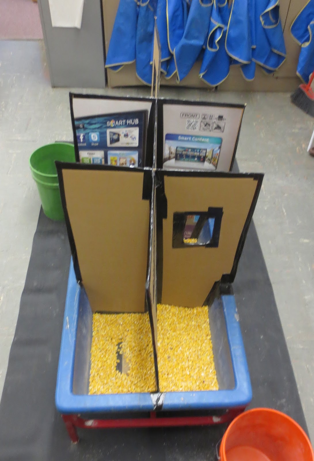 This year, I used a box from a large flat screen TV. The box was big, which allowed me to cut one cardboard panel that was long enough to divide my two sensory tables lengthwise down the middle.