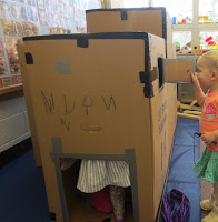 Four big wardrobe boxes were taped together with passage ways between the boxes on the inside and openings all around and on top for the children to peek out of and into.