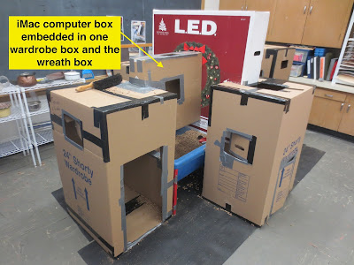 To this setup, I added two new boxes. One of the boxes was an iMac box. This box was embedded on one end into one of the wardrobe boxes and embedded on the other end into the second new box, a large wreath box.