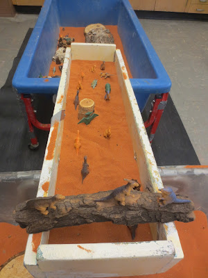 I thought with all the natural elements, the children might build environments for the dinosaurs. Nope. They had other ideas and many of them had to do with pouring sand. Below, a child buries a little pteranodon.