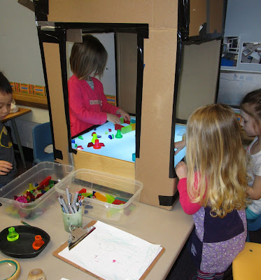 It grew organically up and out. By the end, it was about 5 feet long, 2.5 feet wide and 2 feet high. Interestingly, we had to move it each day because we used this same table for snack. The top of the light table cabinet was were it resided when it wasn't on the table. Yet, another use for the big box!
