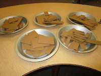 As it turned out, though, we were not done with gluing cardboard. I decided to follow the individual projects with a large group cardboard sculpture. I rounded up some more cardboard---again, not so hard. I laid out a provocation using a large piece of cardboard as the base. I glued a long, narrow box in the middle to give the invitation a third dimension.