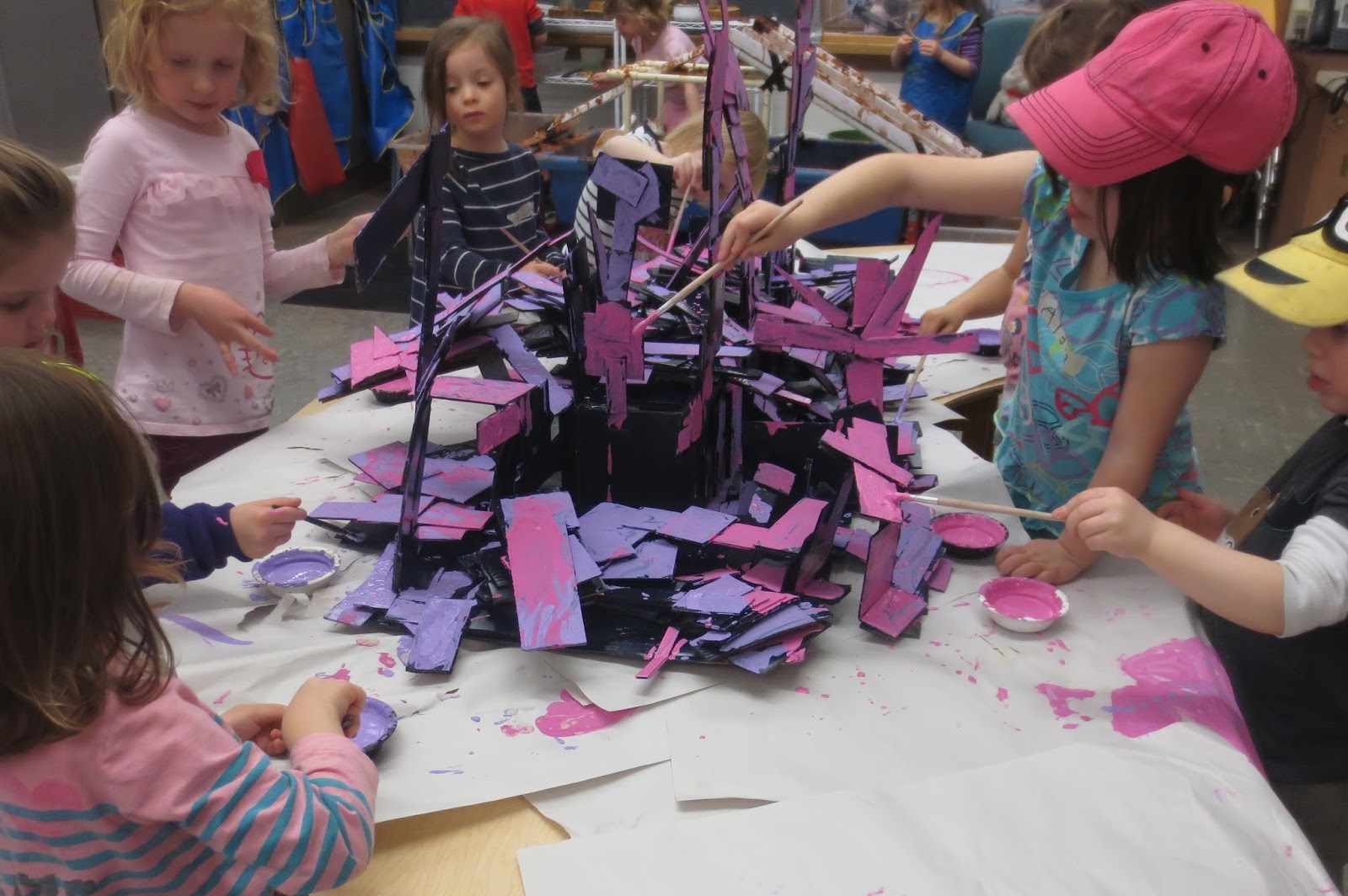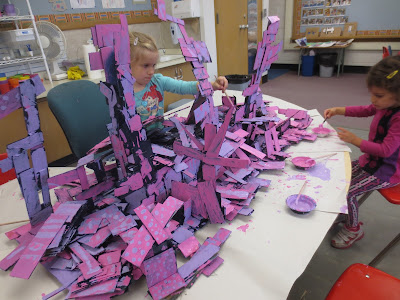 That took a week, but we were not finished. Next we painted the sculpture. Before the children painted the sculpture, I spray painted the whole thing with black spray paint. I only offered two colors for painting the sculpture: lavender and pink.
