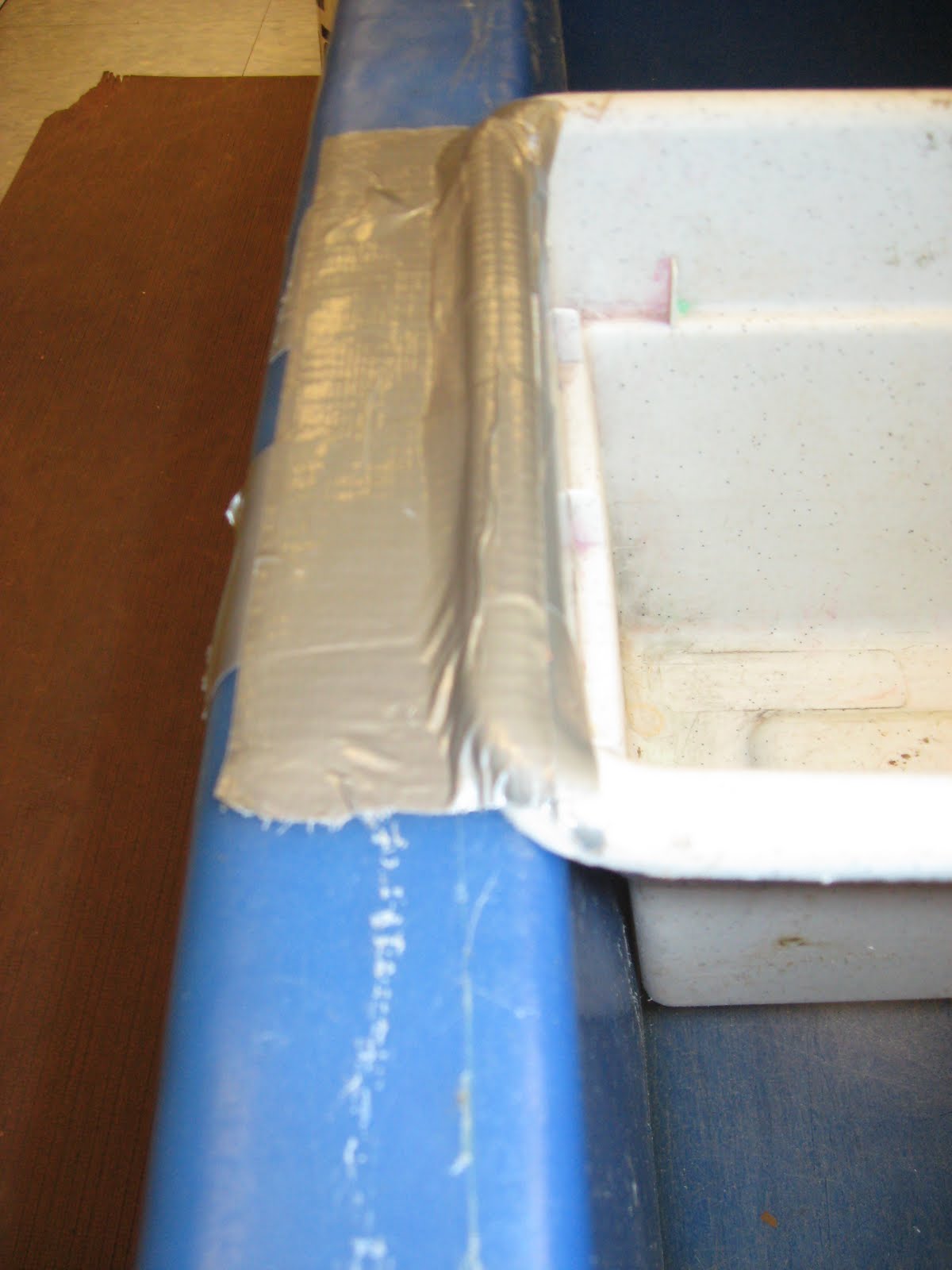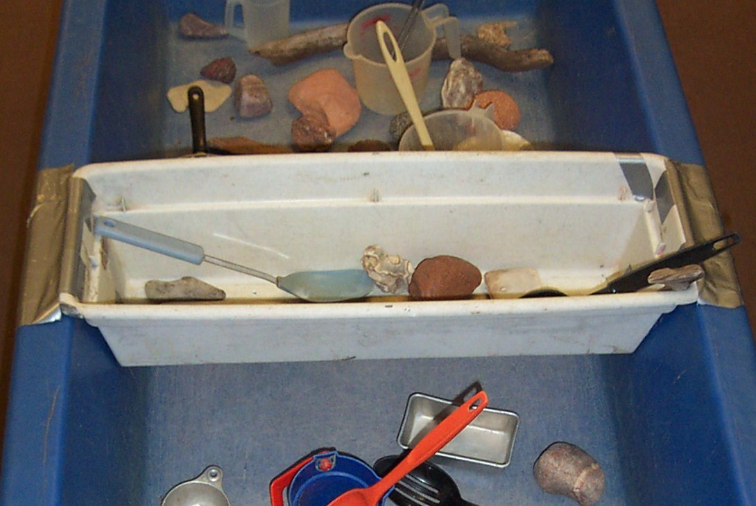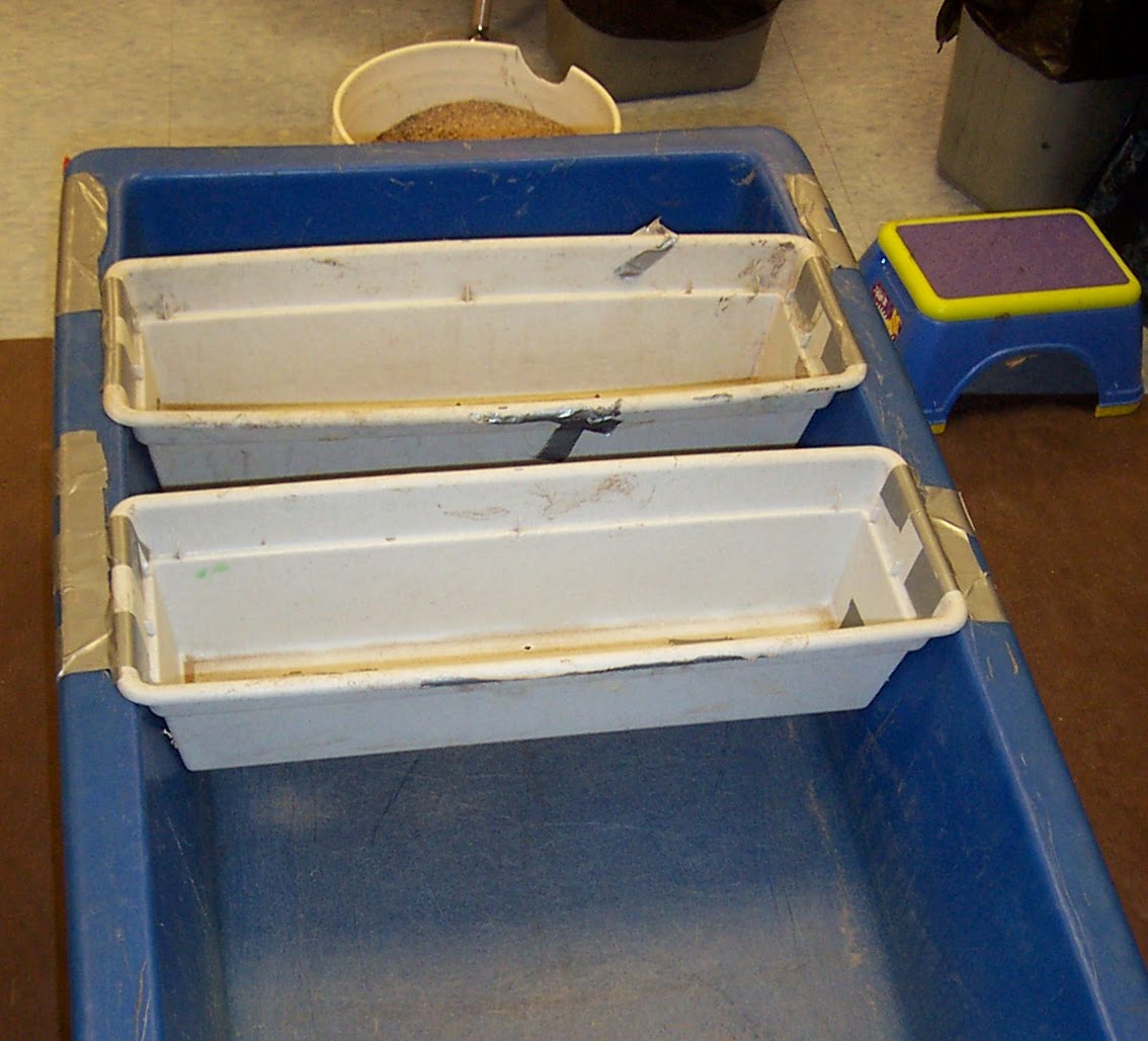 Besides the planter tray in the middle, I found some old dark room trays. I was able to arrange one of the darkroom trays so the bottom on one side rested on the lip of the planter and the bottom on the other side rested on the lip of the sensory table. With this arrangement, there are more levels and more spaces to explore. There are now three levels inside the table and spaces on either side of the trays, over the trays and under the trays.