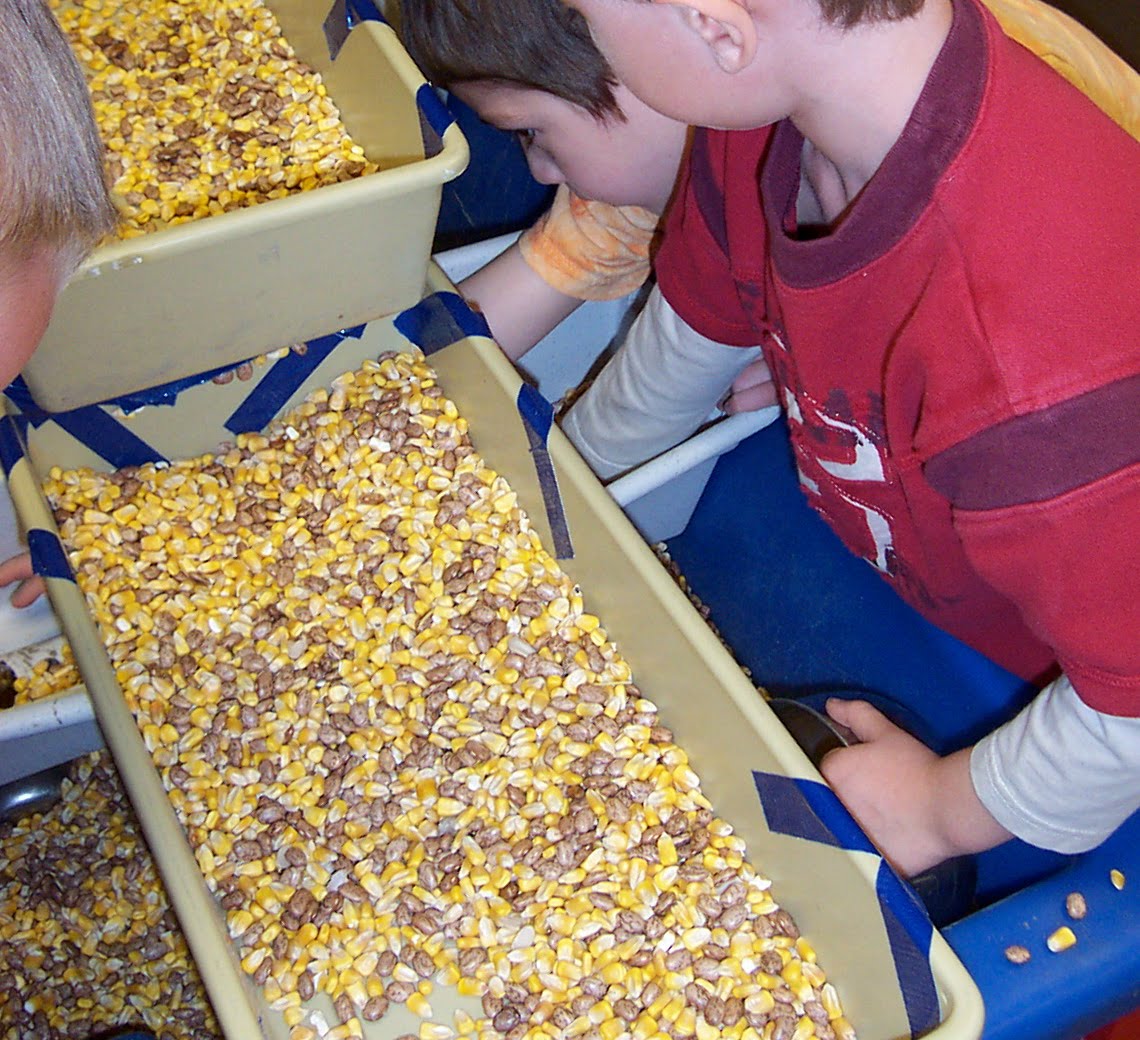 These children said they were filling the top trays with all the seeds. Could they do it? The answer is not as important as the process. First they gave themselves a task and pursued it with the utmost importance. Why this task? I think it has something to do with their innate drive to transport. They worked very hard even though gathering all the seeds from all the spaces involved more complex operations, like scooping the corn from the bottom trays. This involved first scooping with spoons under the top trays, pulling the scoops back and then lifting and pouring into the top tray. The spoons lost their usefulness because the bottom of the bottom trays are not flat and the children were getting fewer and fewer seeds. Next, they started to use their hands to grasp the seeds. When I look at the picture, I think of the feeling of space, particularly depth, they are experiencing as they reach all the way under the tray to get the seeds. That is not only the vertical depth of reaching into the tray, but it is also a horizontal depth of reaching way under the tray.