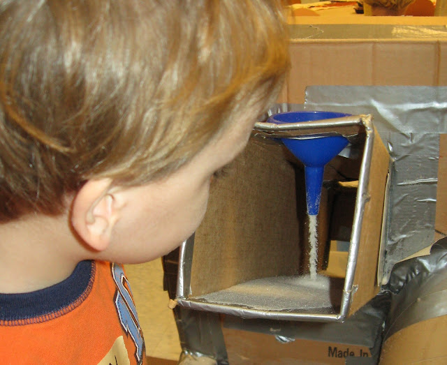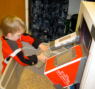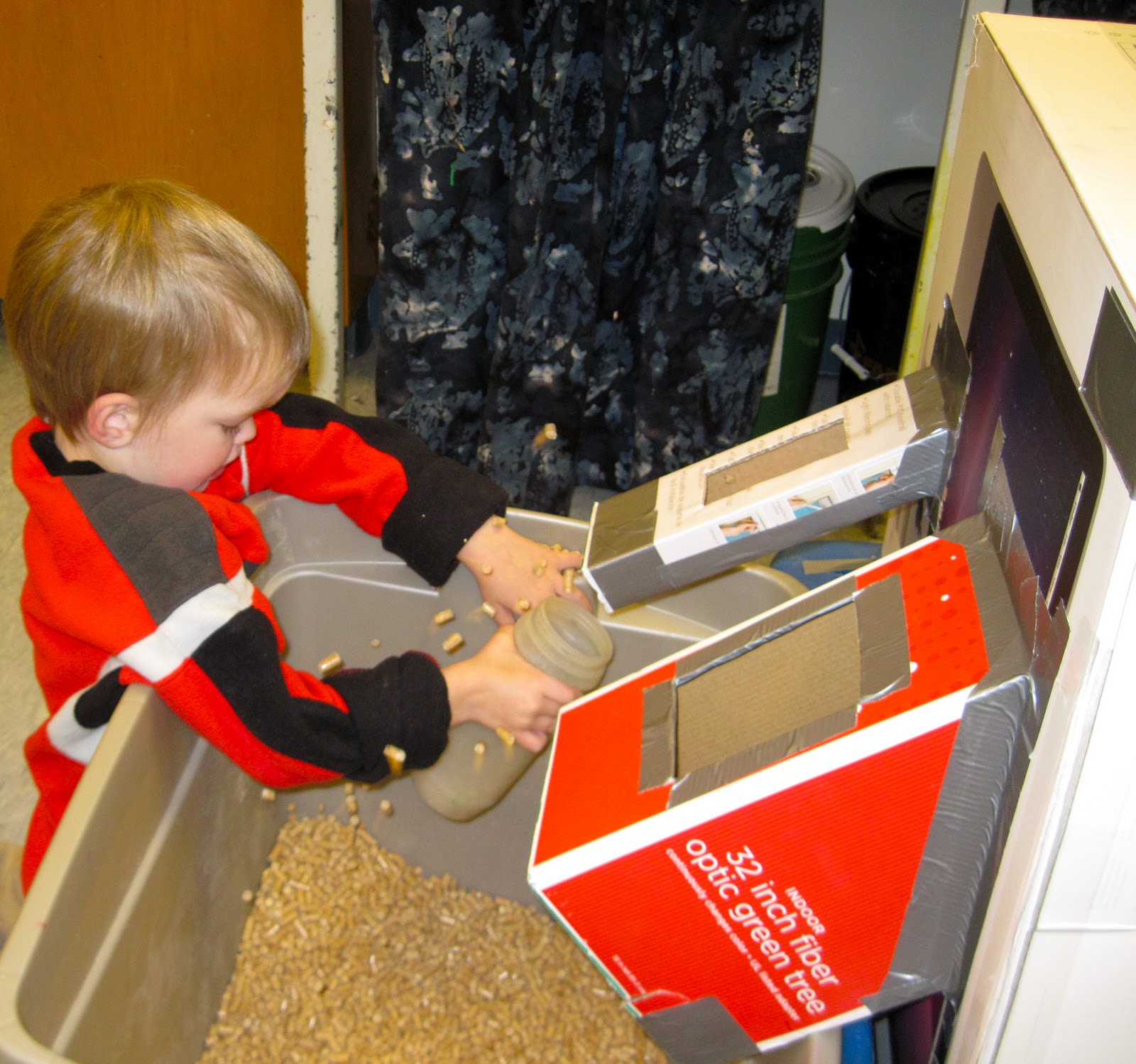 Charlie hears the pellets falling in the pail and comes over and says: "Oh, we're moving it into the bucket, now!"
