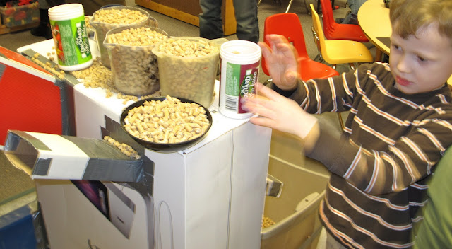 David is in another part of the room by himself. No one is at the table at this point, so I invite him over to see the pellets and the divider. See his play in a previous post