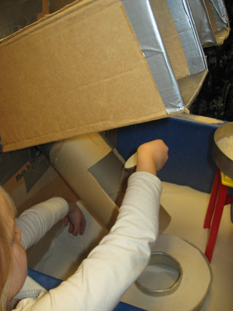 David pours the pellets into the pail next to the table. I say: "I heard that." He smiles and does it again. Maggie hears David pour the pellets into the bucket. To her, though, it sounds like David has poured them onto the floor. She cannot see David because she is on the other side of the divider. She pours pellets onto the floor and looks to me for validation. She is expecting me to say the same thing I said to David. She was surprised when I told her not to pour the pellets on the floor. I explained that David was pouring into the bucket and not onto the floor. She scooped up some pellets, walked around the divider and poured some pellets into the same bucket. Now I could tell her: " I heard that." She was validated and quite happy with herself. This also moved her to the other side of the table.