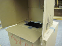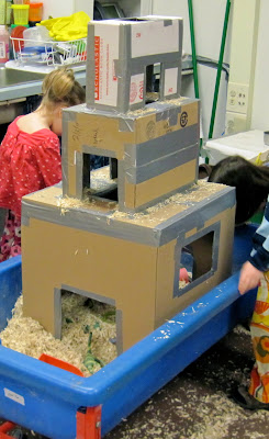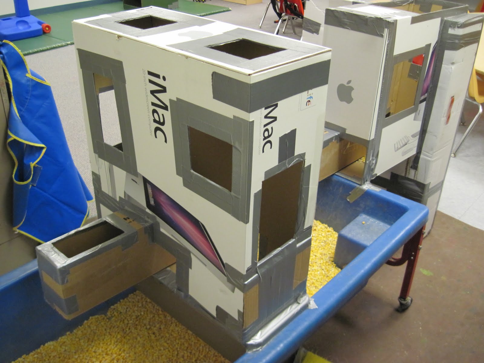 I change the apparatus in the sensory table every week.  (We all need a creative outlet and this is mine.)  What that means is that there is a completely new apparatus for the children to explore on a weekly basis.  After building the Bridge, though, I decided to add onto the existing structure instead of building a completely new one. I had another IMac box from school and a channel box I found at a hardware store so I added those two to the existing structure.