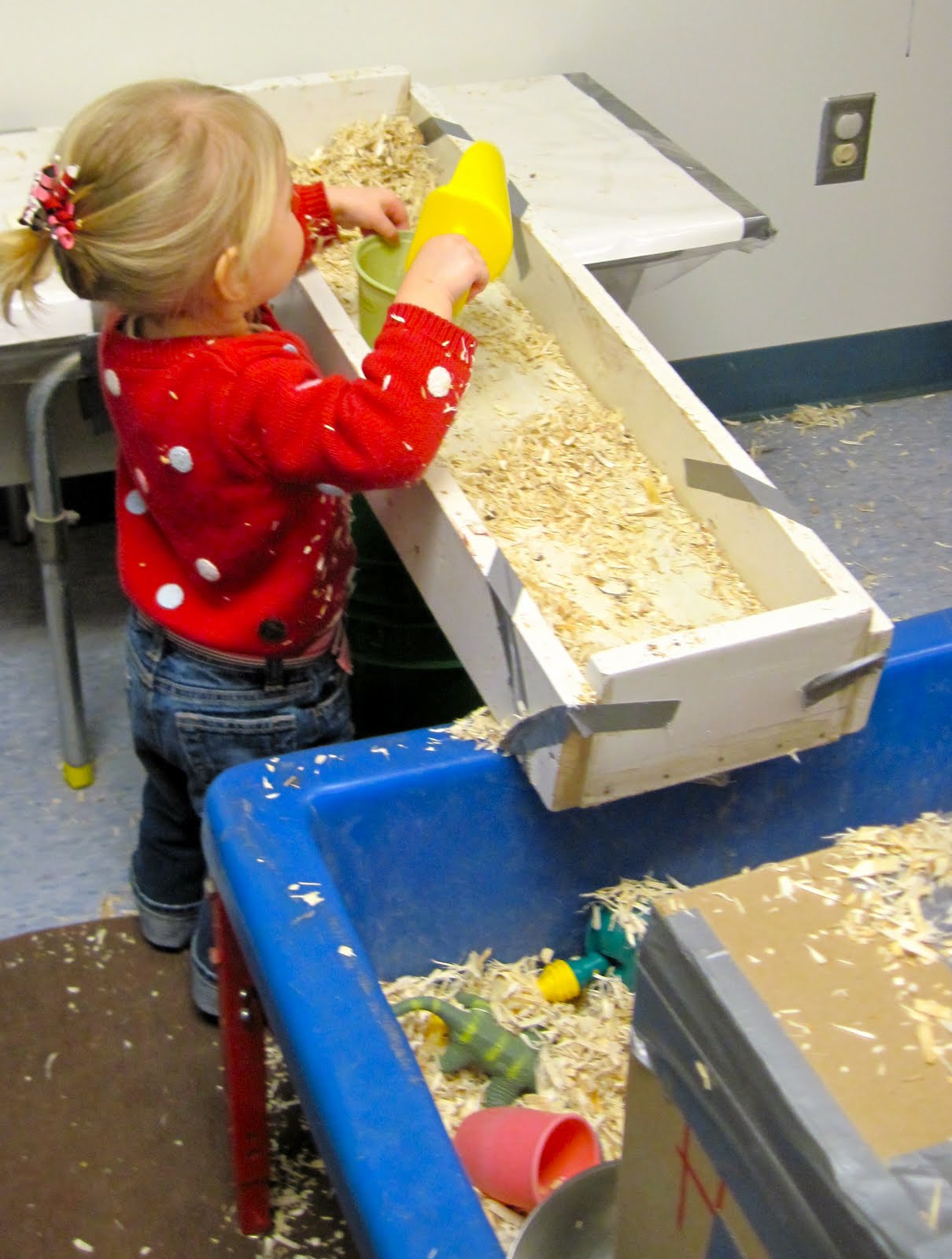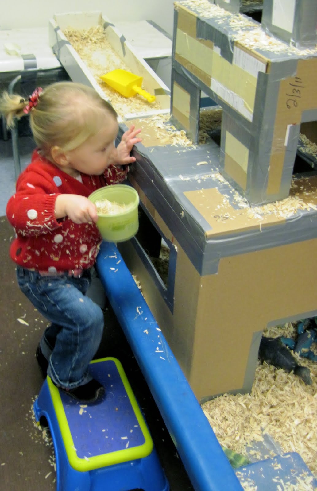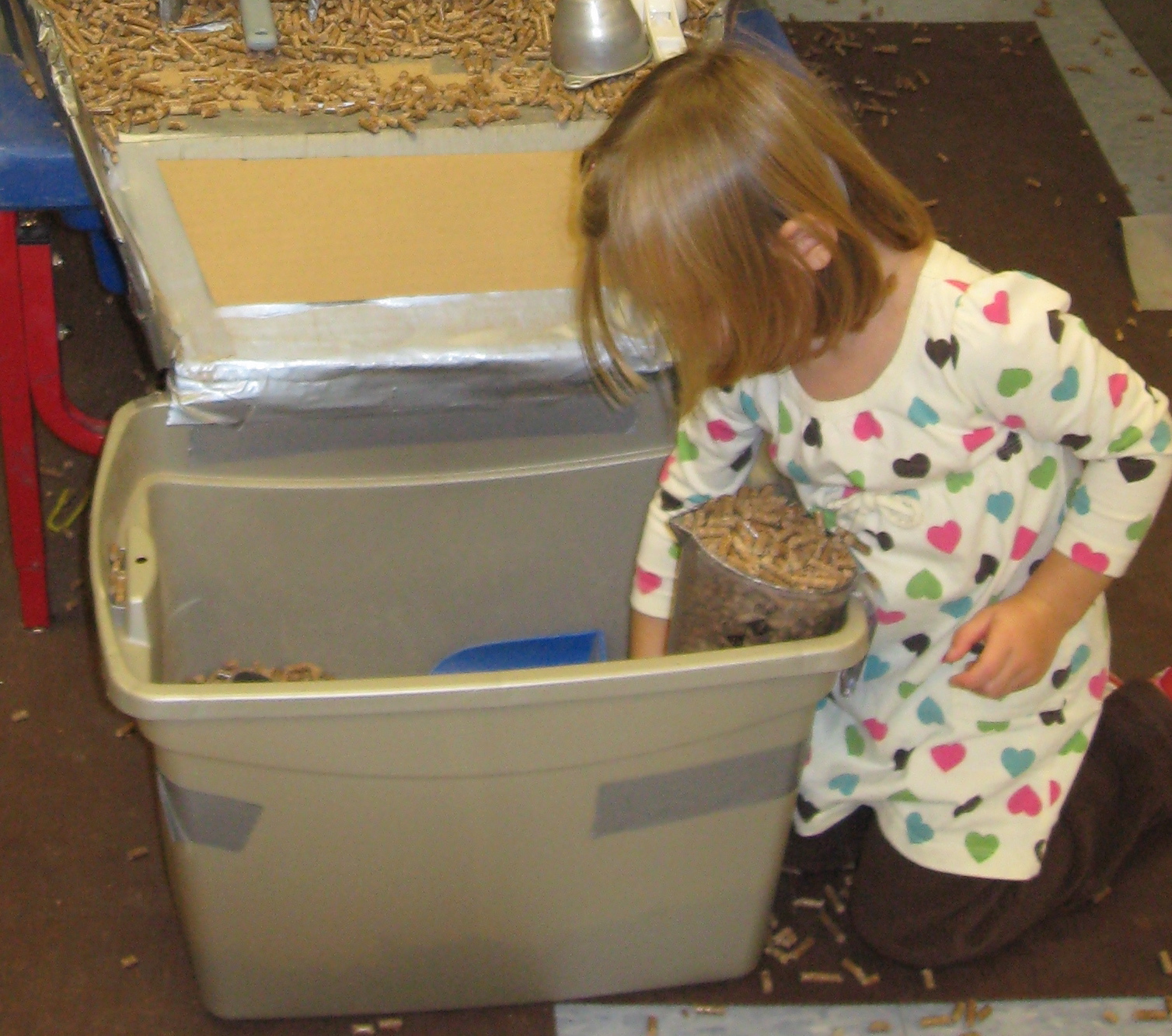 And sometimes, a child will work with holes on more than one level simultaneously. In the picture below, a child is pouring bedding into one of the holes on an upper level with one hand and then trying to catch it on the bottom level with her other hand. She has given herself a nice little large-muscle, eye-to-hand coordination undertaking.