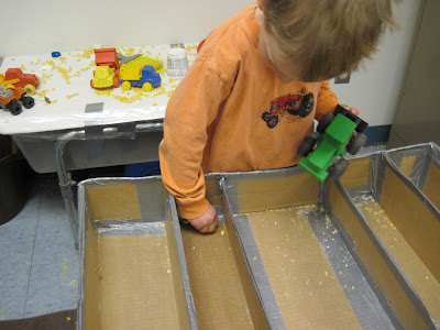 This horizontal channel apparatus that rests on top of the sensory table lends itself nicely to play with cars and trucks, especially construction vehicles.
