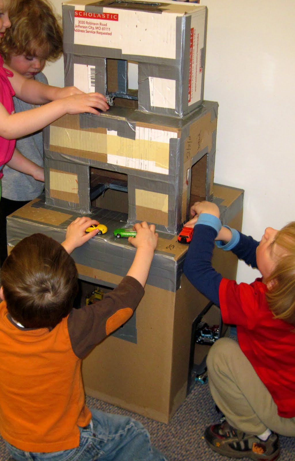 This apparatus is sturdy enough to use outside of the sensory table.  I set it up near the block area where I also keep our little cars.  Here you can see it became a garage.  Cars were obviously driven around the edges, but many ended up in the holes.