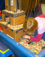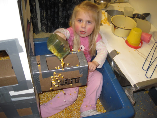 With the addition, there are more inside spaces to discover.  The view below is inside the new IMac box.  You can only see the child's arm because he is watching the corn fall out on the outside of the box as he scrapes it with the spoon from the inside.  Instead of eye-to-hand coordination, this might be considered mind-to-body coordination.  Without seeing what his hand and arm is doing, there must be a mental and physical loop working to complete his actions.  That sounds like a higher order thinking skill.