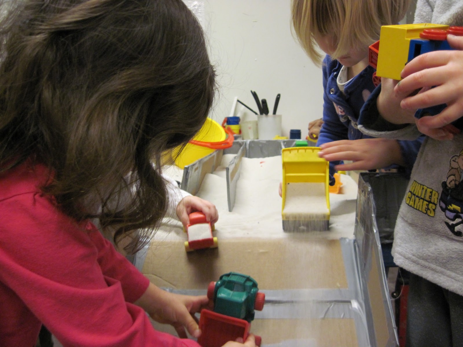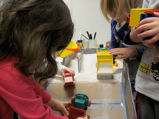 The children will fill up the dump trucks, drive them to the edge of the ramp, and then dump. Did you notice there are four sets of hands in this small space?