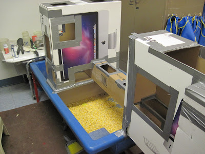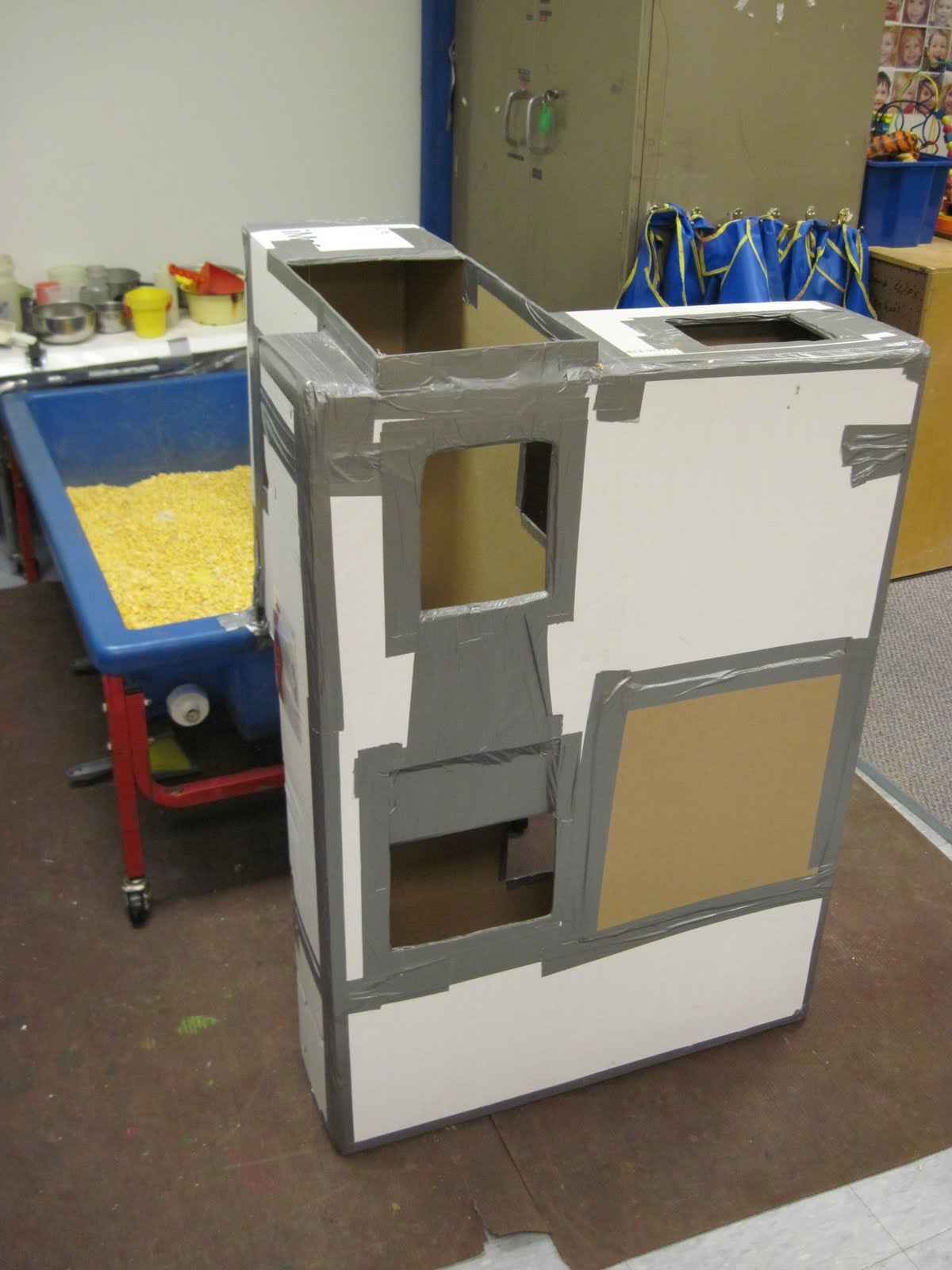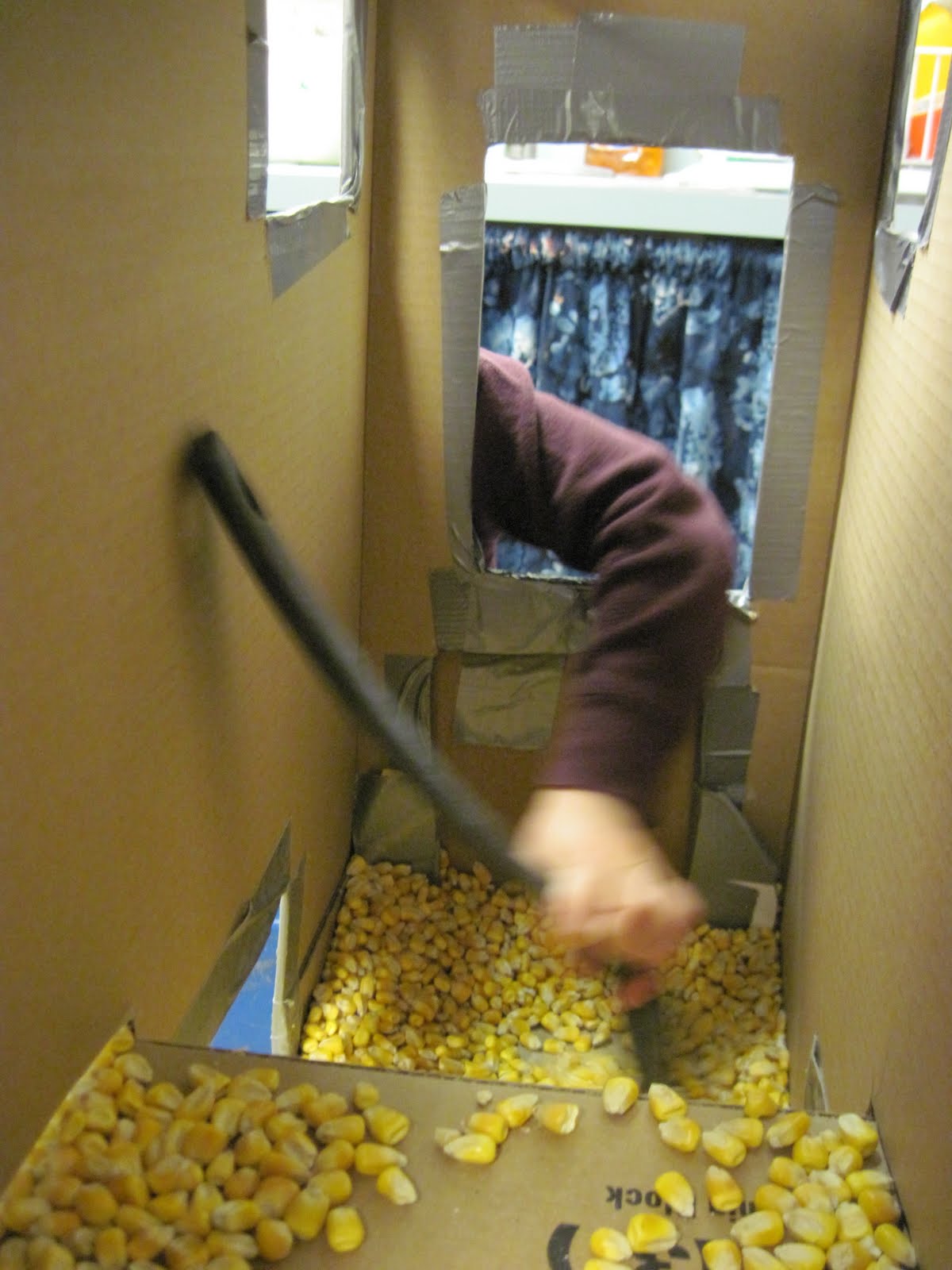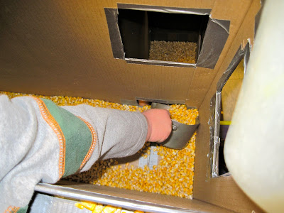 Did you notice the plain cardboard patch on this side?  That used to be a window, but when the children started to pour the corn into the top of the apparatus, way too much came out that hole onto the floor.  Cardboard holes are easy to patch with cardboard and duct tape.