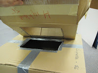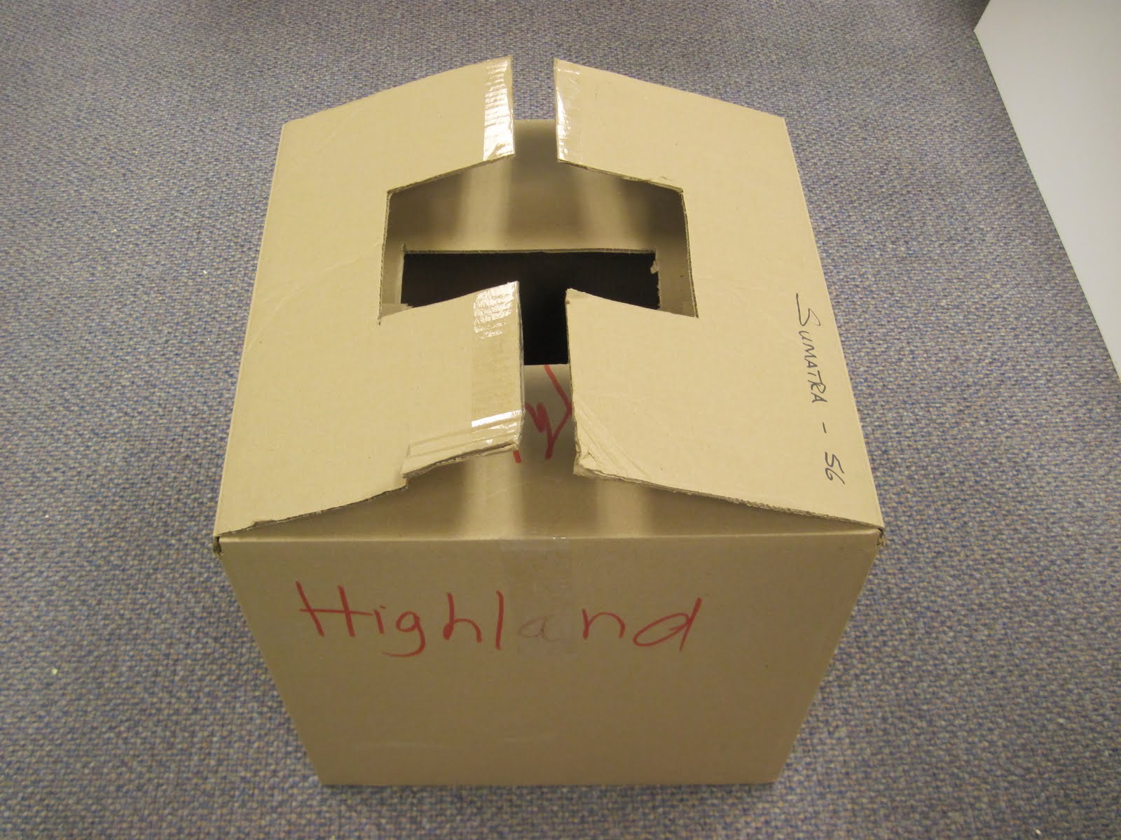 Notice that there are holes on the top on both boxes.  Going down, there is two openings facing the camera.  Inside, you can see another window that connects the two boxes.  There are four more outside holes and one inside hole.  By the way, by taping the boxes together at the windows, I get a sturdy structure.  I also duct tape all the windows to prevent paper cuts.